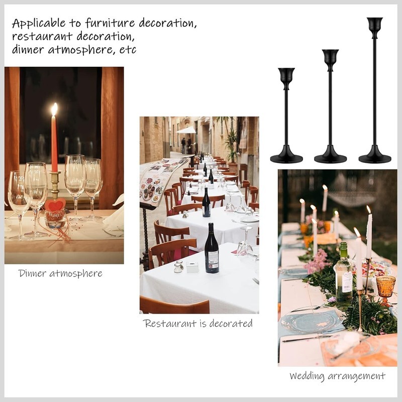 ??Sturdy and Stable black candlestick holders?Made of solid, durable, high-quality aluminum alloy material, this candlestick holder is durable and sturdy enough to hold tall taper candles. Each black candle stick holder set can fit 3/4 inch and 7/8 inch small pillar candles as well as LED cone candles to match your dining table decor.It provides a stable base for your candles,ensures stability and longevity for your candles.