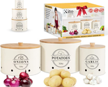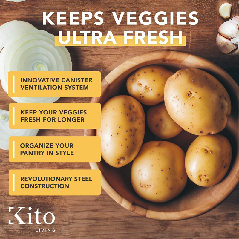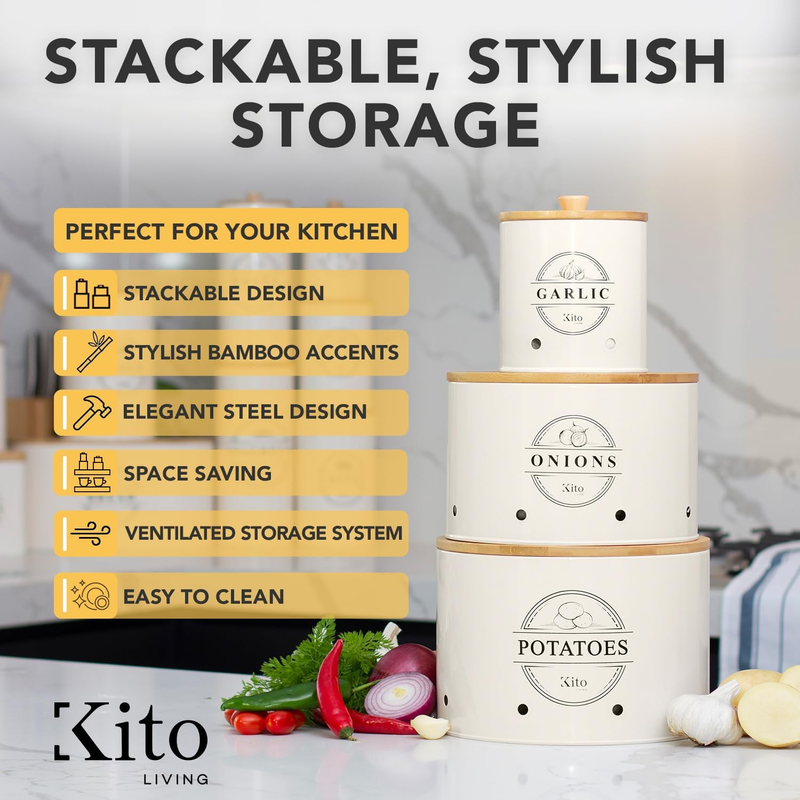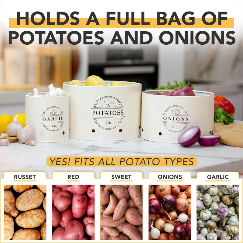 SPACIOUS AND STACKABLE: Our pantry storage containers offer more space and use a unique stacking design to help you store more while taking up less space on your counters. Each pack comes with a potato canister (10 x 7.1 inch / approx. 8 to 9 lbs), onion canister (9 x 6.2 inch / approx. 5 to 6 lbs), and garlic canister (5.2 x 5.9 inch / approx. 1.5 to 2 lbs)