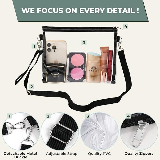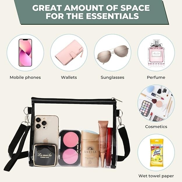??Multi-Purpose Clear Crossbody Bag?You can take this clear bag to stadium sports, concert, festival, travel, airport, other events or activities. It is also convenient for you to check everything you need to be ready.