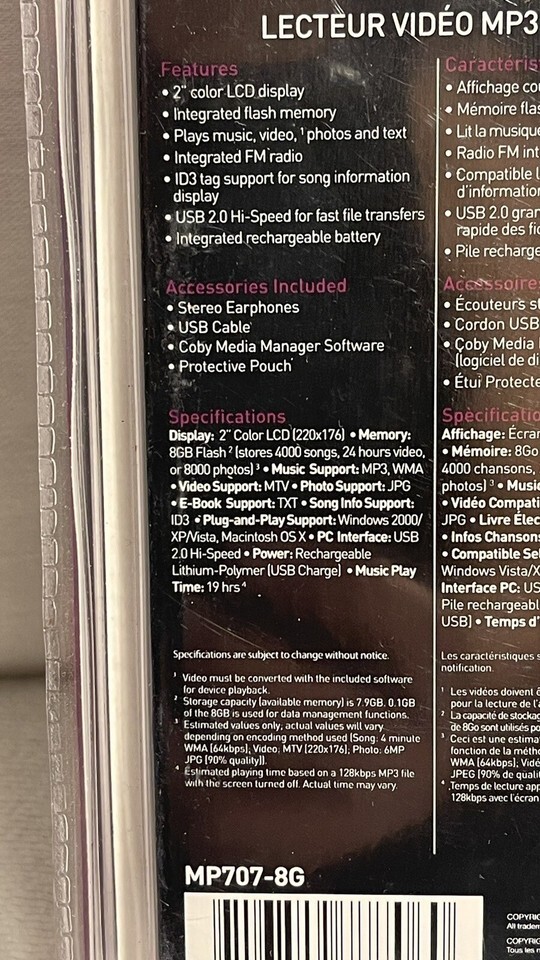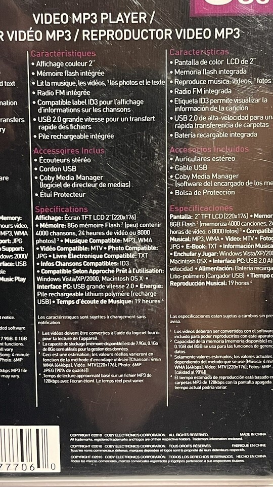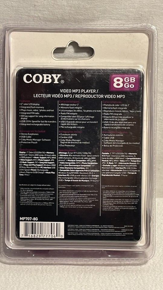 Get ready to enjoy your favorite music on the go with this Go Video MP3 player from Coby. This brand new, factory-sealed player has a generous 8GB of flash-only memory, which provides ample storage for all your favorite songs. Enjoy up to 15 hours of battery life while listening to music and take advantage of the headphone jack for private listening. This player supports various file formats including MP3 and has a color screen size of 1.8 inches. With USB 2.0 connectivity, you can easily transfer your music files from your computer to the player. This USB MP3 player is a great choice for any music lover looking for a reliable and portable device.
