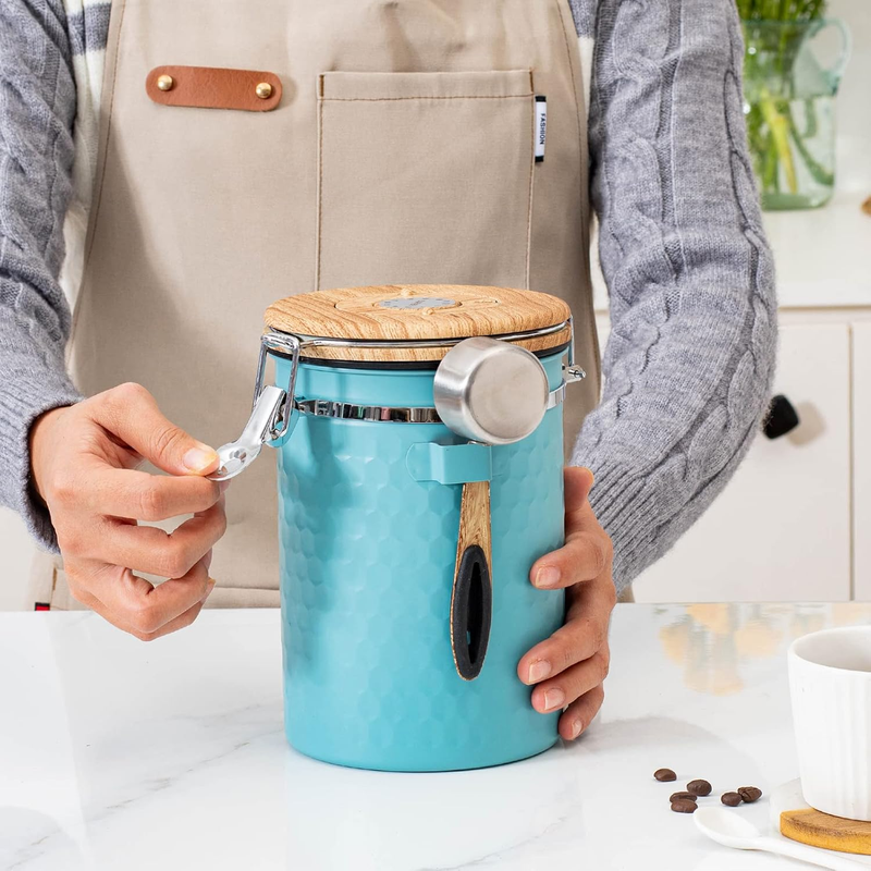 Coffee Canisters Airtight Coffee Bean Storage Container Kitchen Stainless Steel Food Storage Container with Scoop Date Tracker CO2 Valve 61Fl Oz (Lake Blue)