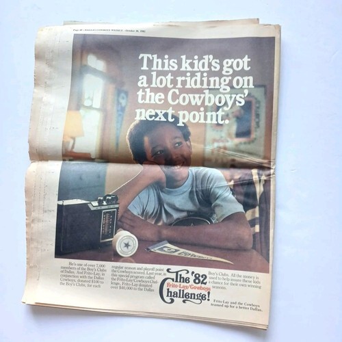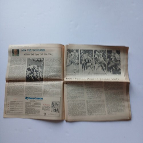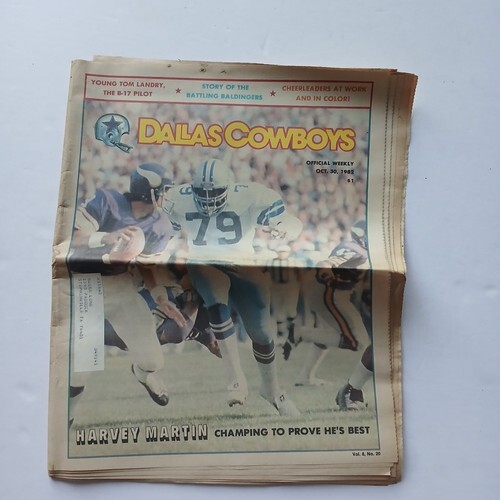 Dallas Cowboys This listing is for an original copy of The Official Dallas Cowboys Weekly Magazine. This is the October 30, 1982 Issue. This vintage newspaper style magazine features articles and stories about various players, coaches and team members. The newspaper is complete. It has minor to moderate wear and may have some tiny edge tears or tattering along the edge. There may be small pieces torn out along the edges of some pages or on the cover. The newspaper is creased in the middle where it has been folded. There may be some minor water damage or water stains to the cover or some pages. There are no missing pages and the pages are readable. There may be some yellowing of the pages due to age. As with all older newspapers, be careful when handling as some pages may be brittle. Please examine the pictures carefully if you have any concerns. Feel free to ask questions. This item ships USPS Ground Advantage. International buyers use international shipping program. This item will ship with a stiff cardboard backer to prevent bending or creasing by the mail carrier during shipping.