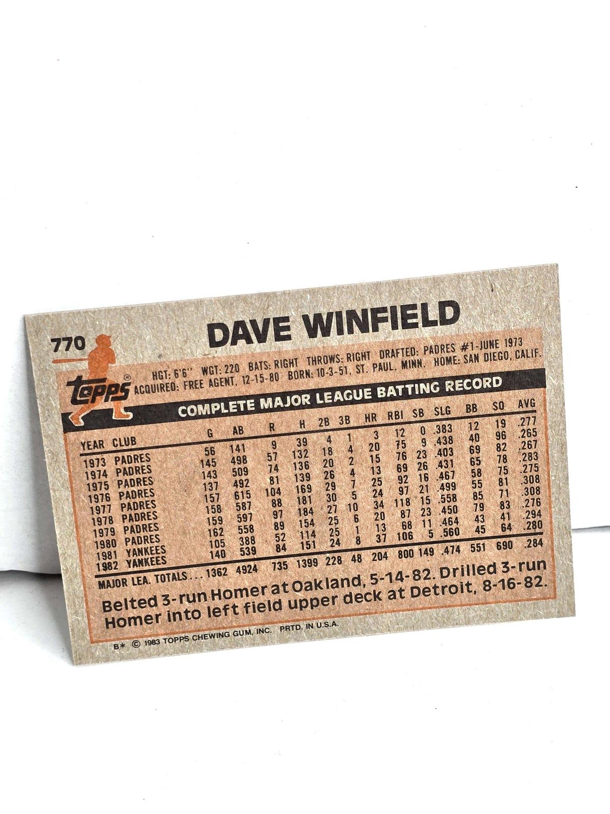 Dave Winfield Yankees Baseball 1983 Topps No. 770 - Near Mint Condition, See Photos ... Includes FREE SHIPPING. Note sports memorabilia market hit $16 billion in 2023. Projections indicate it will reach $52 billion by 2032, with a compound annual growth rate (CAGR) of nearly 14% during the forecast period (2024-2032).