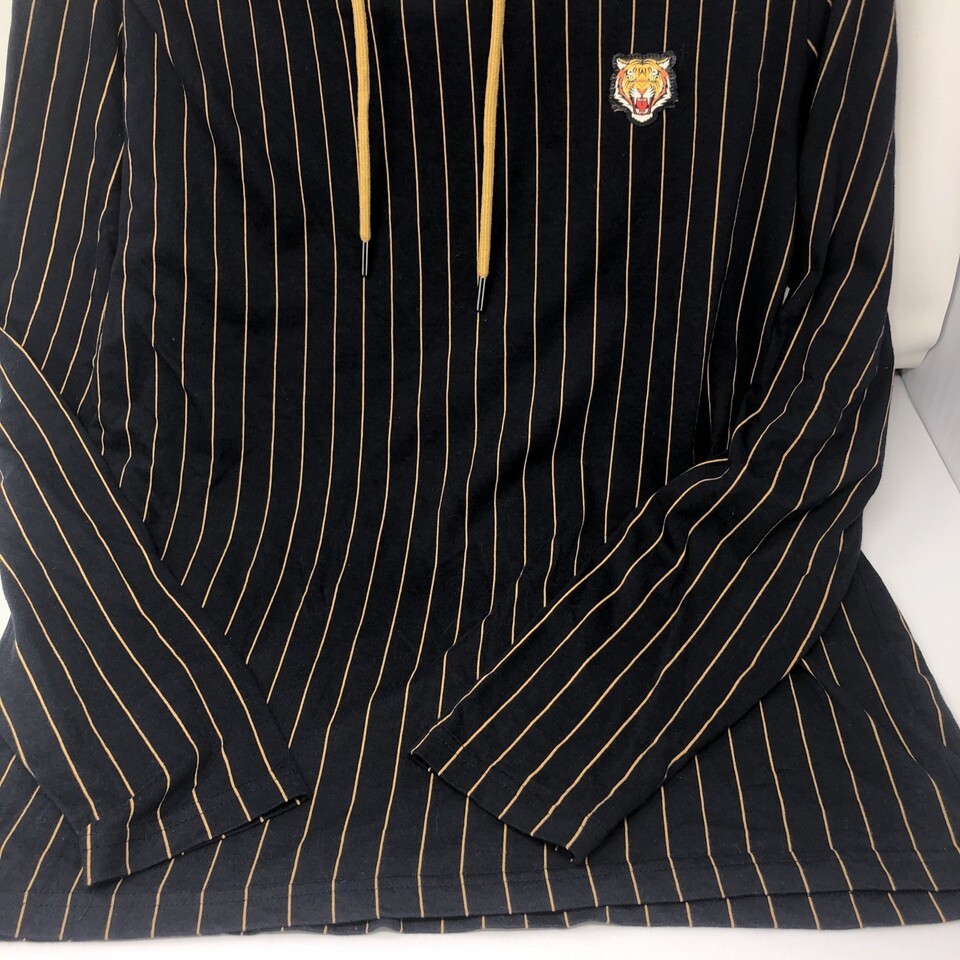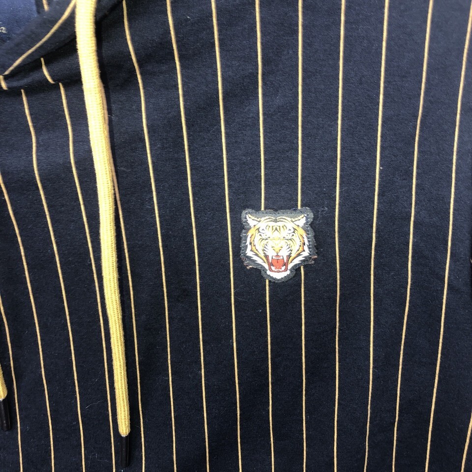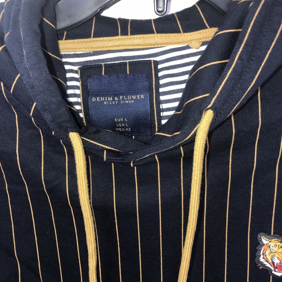 The Denim Flower Ricky Singh Tiger Pullover Hoodie is a stylish men's clothing item featuring a unique dark blue color with gold stripes. Made with denim fabric, this hoodie from Blue brand has a regular size large and a pullover style. The hoodie combines a trendy design with a touch of floral theme, making it a fashionable choice for activewear.