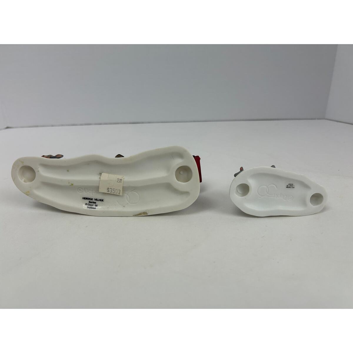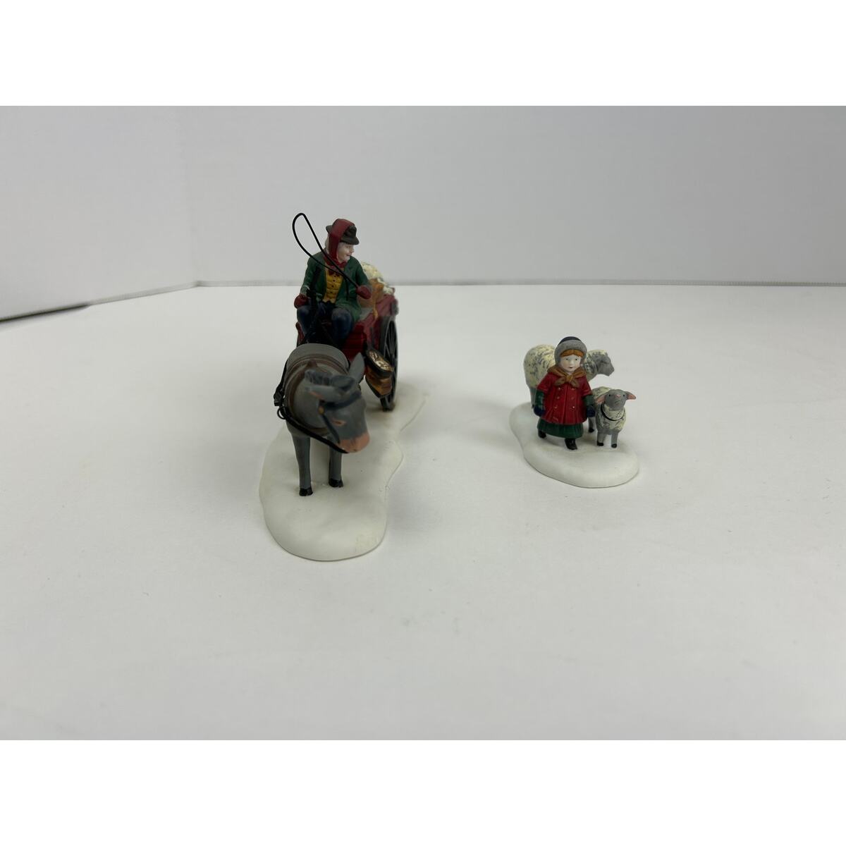 ?Bringing Fleeces To The Mill? is a Dickens Village accessory set from the Heritage Village Collection by Department 56. This two-piece scene shows a farmer driving a donkey cart piled with wool fleeces while a young girl walks along with two sheep. Heritage Village Collection, Dickens Village Series accessory ?Bringing Fleeces To The Mill?, item 56.58190, set of 2 pieces Main piece shows gray donkey pulling a red cart loaded with tan fleeces, driver in green coat and red hood on snowy base Companion piece shows girl in red coat and green skirt walking with two woolly sheep on matching snow base Includes original green Heritage Village hang tag and Styrofoam insert with outer sleeve Hand painted porcelain; nice color and detail on figures, cart, harness and sheep No chips, cracks, or repairs seen on either piece; minor shelf and base wear consistent with light display Cart with donkey is about 6 inches long; girl and sheep base about 3.5 inches long Classic rural farm scene that fits perfectly with textile mill, pasture, or village street displays.