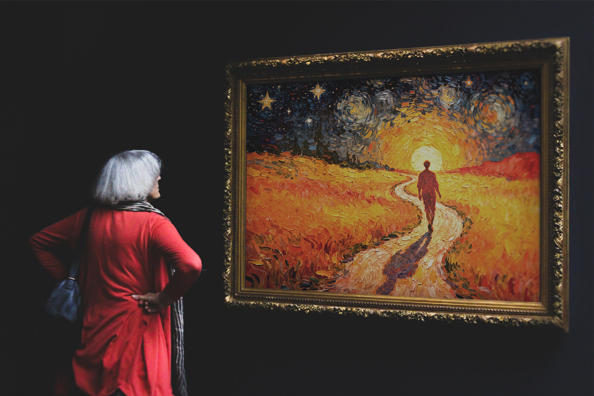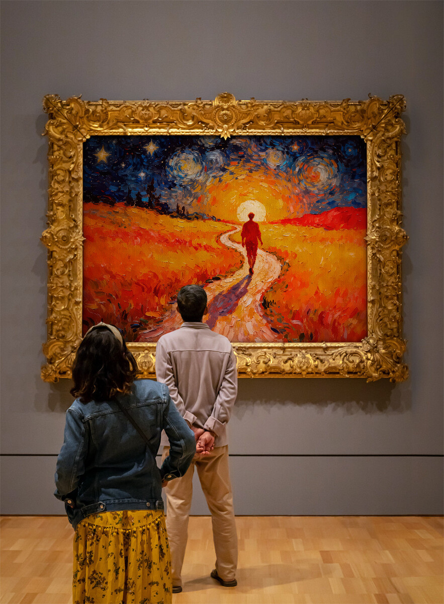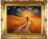 The painting features bold brush strokes and vibrant, intertwined color touches that immerse the eye and soul. The white path leads the figure toward a radiant sun, symbolizing hope and aspirations, while the swirling stars and sky narrate a story of dreams and achievement.