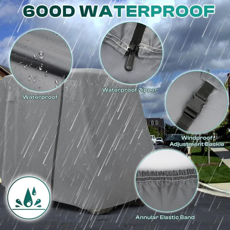 600D High-Density Polyester Fiber: Drive-up golf cart cover made of 600D high-density polyester fiber and solution-dyed long fiber, which can resist the pressure of 1000 Pa, so it is thicker and more durable. It is waterproof, layer-proof and UV-proof for daily use