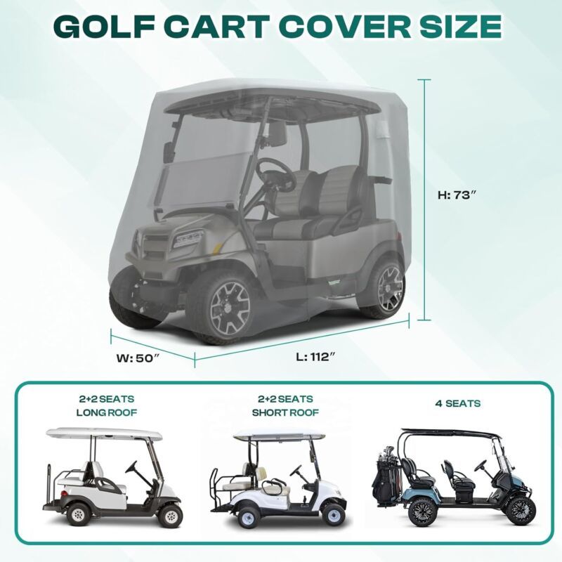 Product Specifications: Heavy duty golf cart cover 112'' long x 50'' wide x 73'' high, fits 80" long car roofs, suitable for 2+2, 4-passenger Club Car, EZGO, Yamaha gas and electric golf carts. And it can be used as EZGO golf cart cover, Club Car golf cart cover and Yamaha golf cart cover