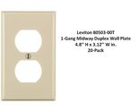 Leviton 80503-00T 1-Gang Midway Duplex Wall Plate, Light Almond (20-Pack/BOX) The Leviton 80503-00T 1-Gang Midway Duplex Wall Plate is designed to provide a clean and functional solution for covering electrical outlets. Made from durable thermoset plastic, this wall plate is both practical and aesthetically pleasing, perfect for any residential or commercial setting. Its light almond color complements a wide variety of interior decors, and its sturdy construction ensures long-lasting performance. Key Features: Color: Light Almond Material: Thermoset Plastic for durability Shape: Rectangular Number of Gangs: 1 gang Wall Plate Style: Duplex Size: Midway Mounting Type: Device mounted with screws Thickness: 1 inch Quantity: 20-pack Certifications: UL Listed, CSA Certified Finish: Smooth thermoset plastic finish Specifications: Dimensions: 3.13 inches (W) x 4.88 inches (H) Switch Type: Compatible with decorator and toggle switches Installation Type: Screw-In Item Weight: 0.634 ounces per unit UPC: 078477278321 Part Number: 80503-T Included Components: Wall plates, installation screws Benefits: Durable Construction: Made of high-quality thermoset plastic that resists cracking and fading. Sleek Design: The smooth finish and light almond color provide a timeless look that fits a variety of spaces. Easy Installation: Designed for quick and straightforward installation with screw mounts. Multiple Uses: Ideal for residential, commercial, or retrofitting installations. Pack Quantity: This pack includes 20 wall plates, making it convenient for bulk installations or replacements. Perfect for use in homes, offices, or commercial buildings, the Leviton 80503-00T wall plate is suitable for any space where a clean, functional look is needed. It is designed to fit Leviton devices, but it is compatible with most standard duplex outlets, making it a versatile option for any installation.