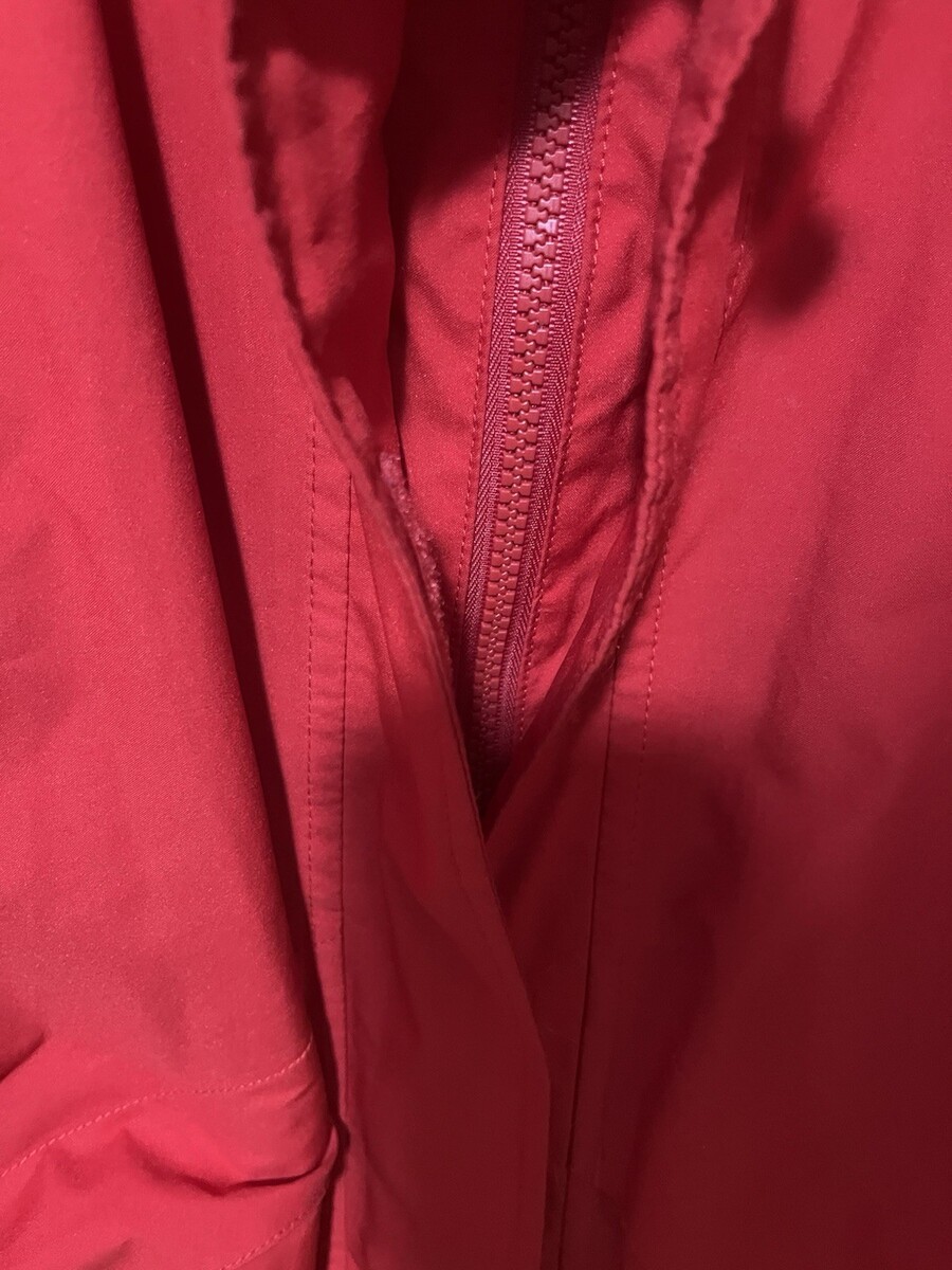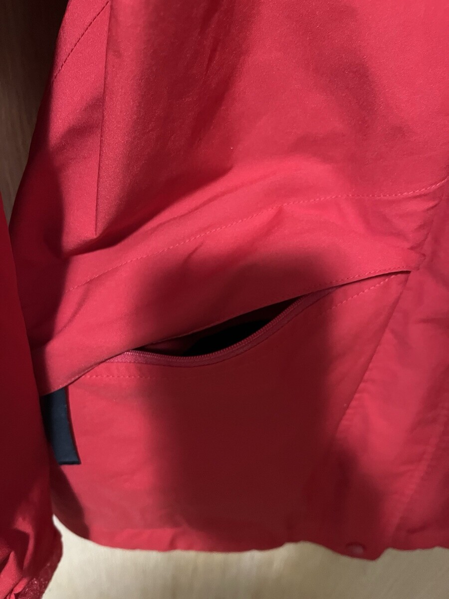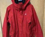 The Eastern Mountain Sport Jacket for women in size small is a waterproof Goretex wind rain jacket designed for outdoor activities in all seasons. Made of polyester with a polyester lining, this red jacket features a solid pattern and long sleeves with a zip closure. It is machine washable and includes zipped pockets, a hood, and is wind-resistant. Perfect for travel, casual wear, or workwear, this lightweight jacket is ideal for staying cozy and dry in various weather conditions. The regular fit and style make it a versatile addition to any wardrobe, suitable for gorp or outdoor themes.