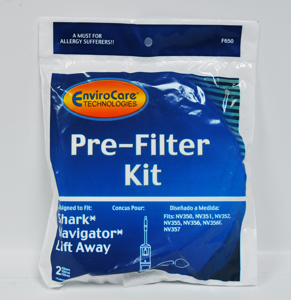Envirocare Shark Navigator Lift Away Pre-Filter Kit F650. 2 Filters in package. Fits: Shark Navigator Lift-Away NV350, NV351, NV352, NV355, NV356, NV356E, NV357, NV360. Manufacturer Part No.: F650 EUR-1803