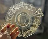 This Fostoria Versailles Topaz Yellow #2375 8 1/2? Bow-Handled Lemon Plate is a vintage elegant glass plate with an etched pattern. It has a glossy finish and is hand-blown. The plate diameter is 6 7/8? and it weighs 9.4oz. The plate is an antique original from the early 20th century (1911-1940) and is a type of plate that is perfect for serving lemon.