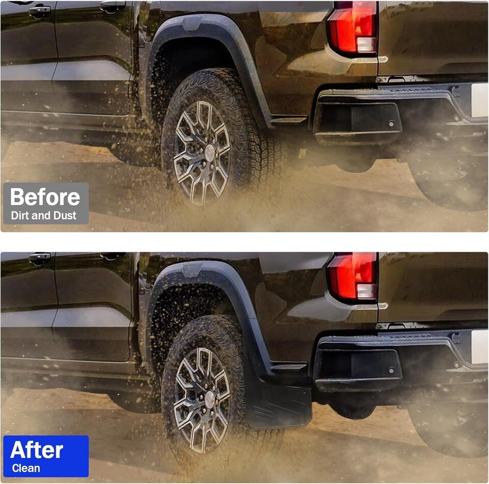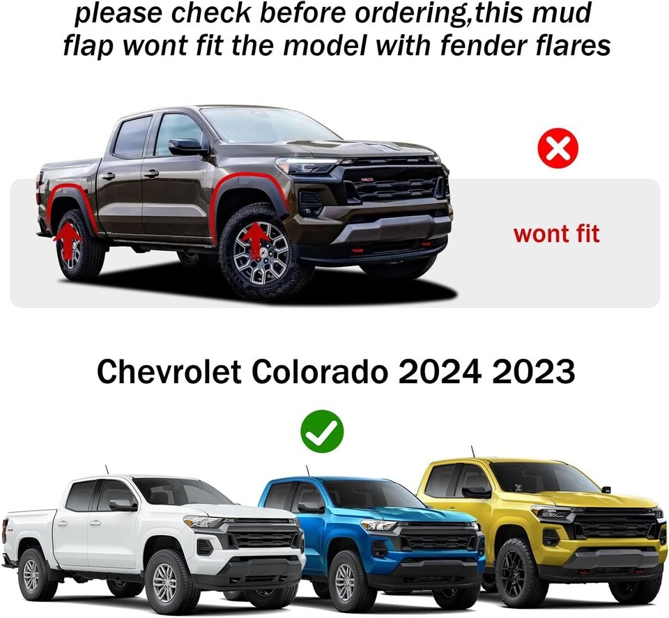 ?UPGRADED - AERODYNAMIC DESIGN? This mud flaps for trucks is tailor-made for 2023 2024 2025 Chevy Colorado, precisely designed to follow the lines and curves of the original vehicle's body to make it more aerodynamic.?Please check if there are fender flares on your truck. This mud flap WON'T fit the model with fender flares?