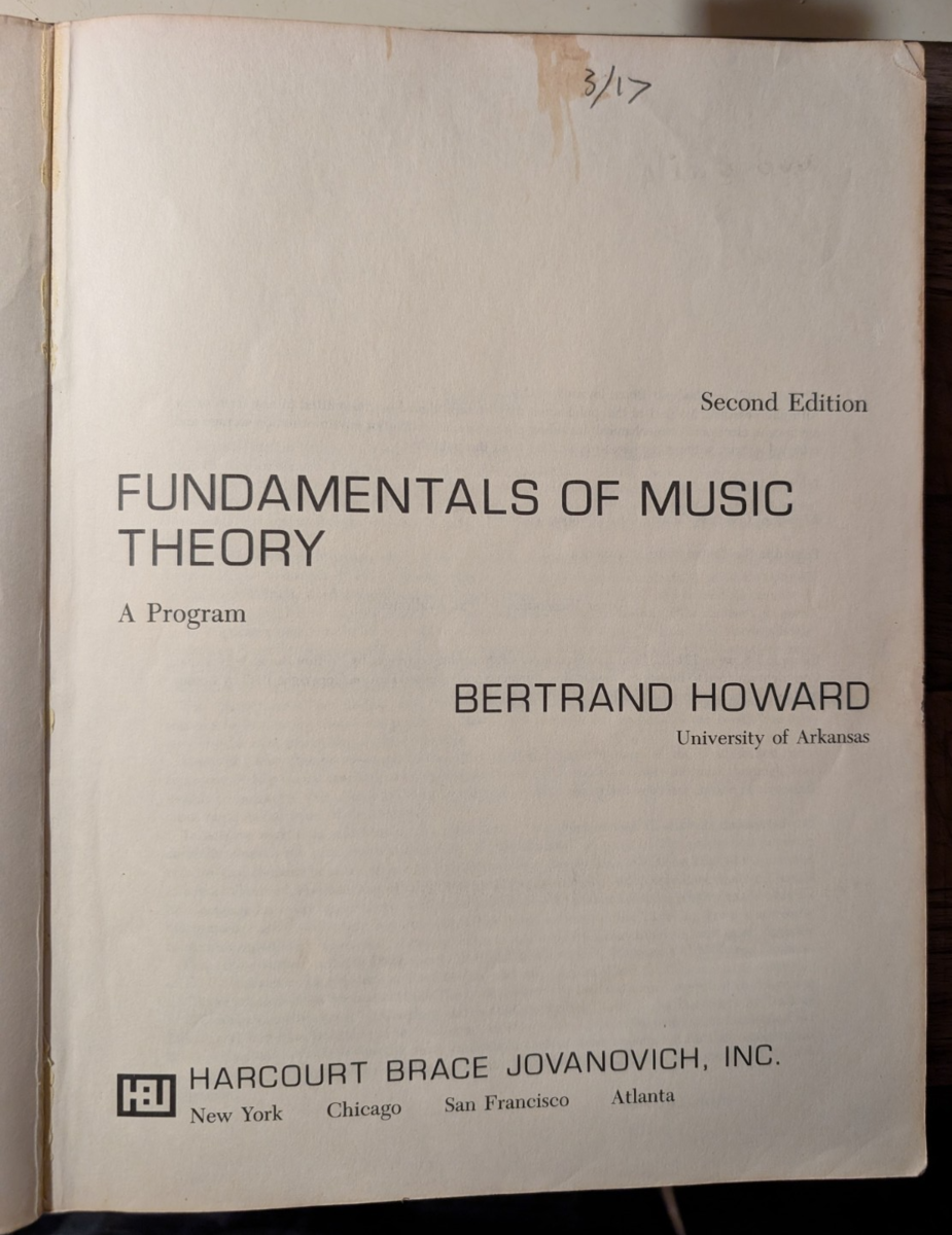 This is the classic Fundamentals of Music Theory, Second Edition by Bertrand Howard?an oversized 1970s workbook that remains a favorite among musicians, teachers, and theory students. These program-style workbooks are valued because they explain concepts with clarity and offer hands-on learning you can?t get from modern texts.