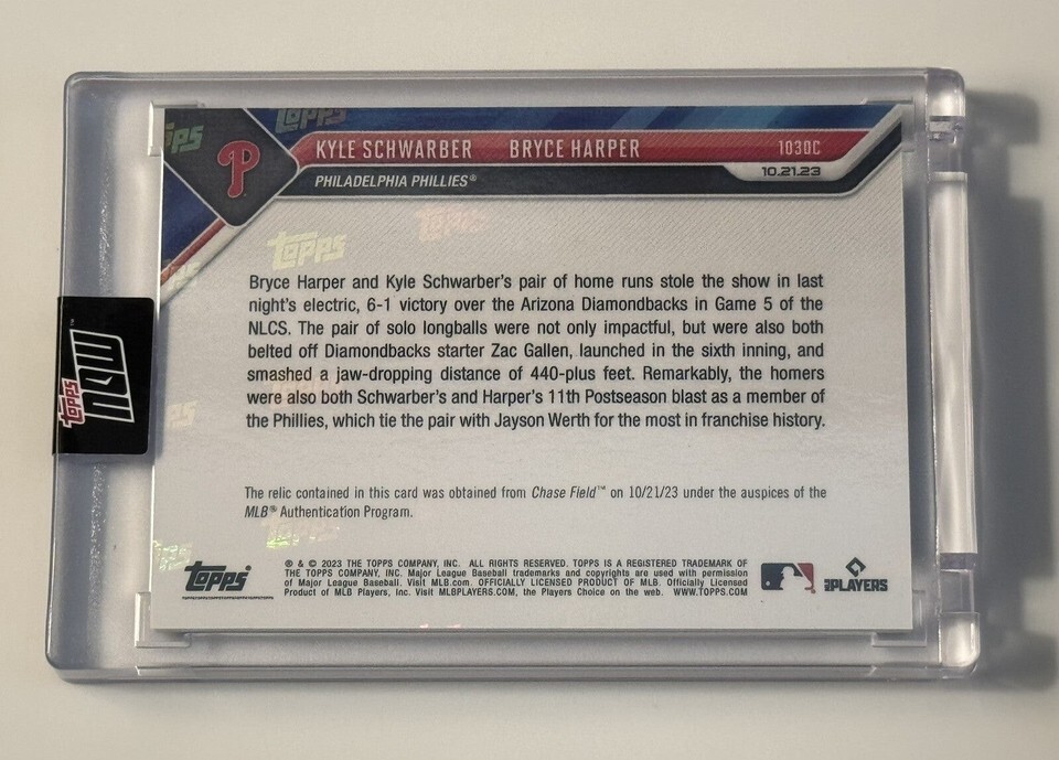 - Game-used Base Relic 7/49 Kyle Schwarber/Bryce Harper - 2023 Topps Now* IN HAND!