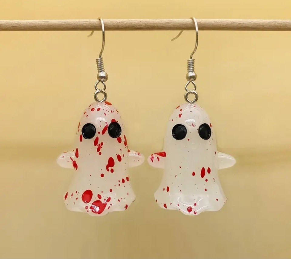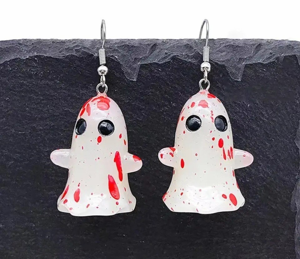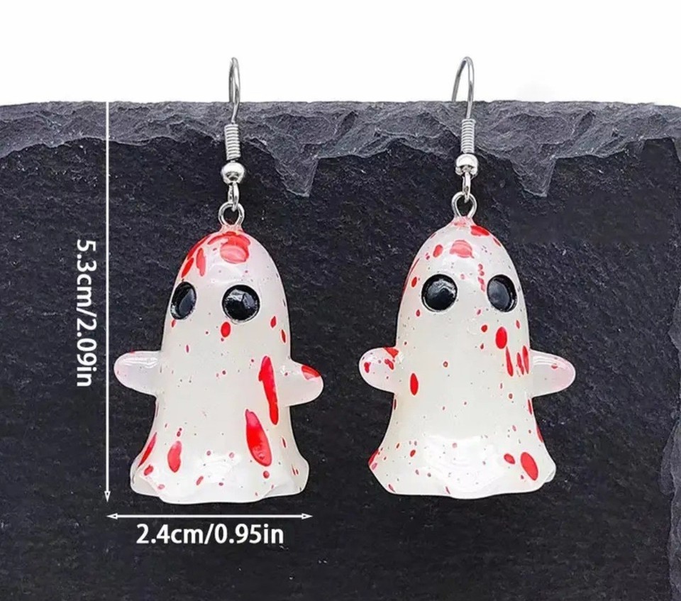 This product is a pair of Glow In The Dark Ghost Halloween Jewelry Earrings. The earrings feature a white resin material with a dangle/drop style, perfect for the Halloween occasion. The iron metal hook closure ensures easy wear on the earlobe. The Ghost brand adds a unique touch to these undated earrings, making them a stylish accessory for any Halloween-themed outfit.