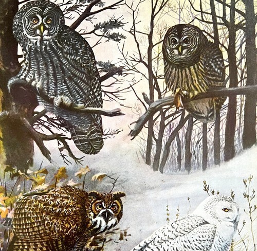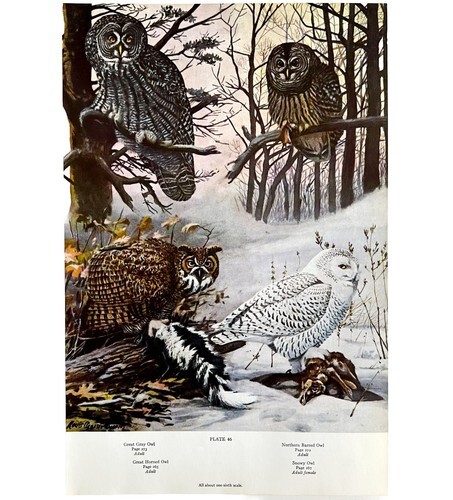 Gray Snowy Great Horned Owls 1955 Plate Print Birds Of America Nature Art DWEE33