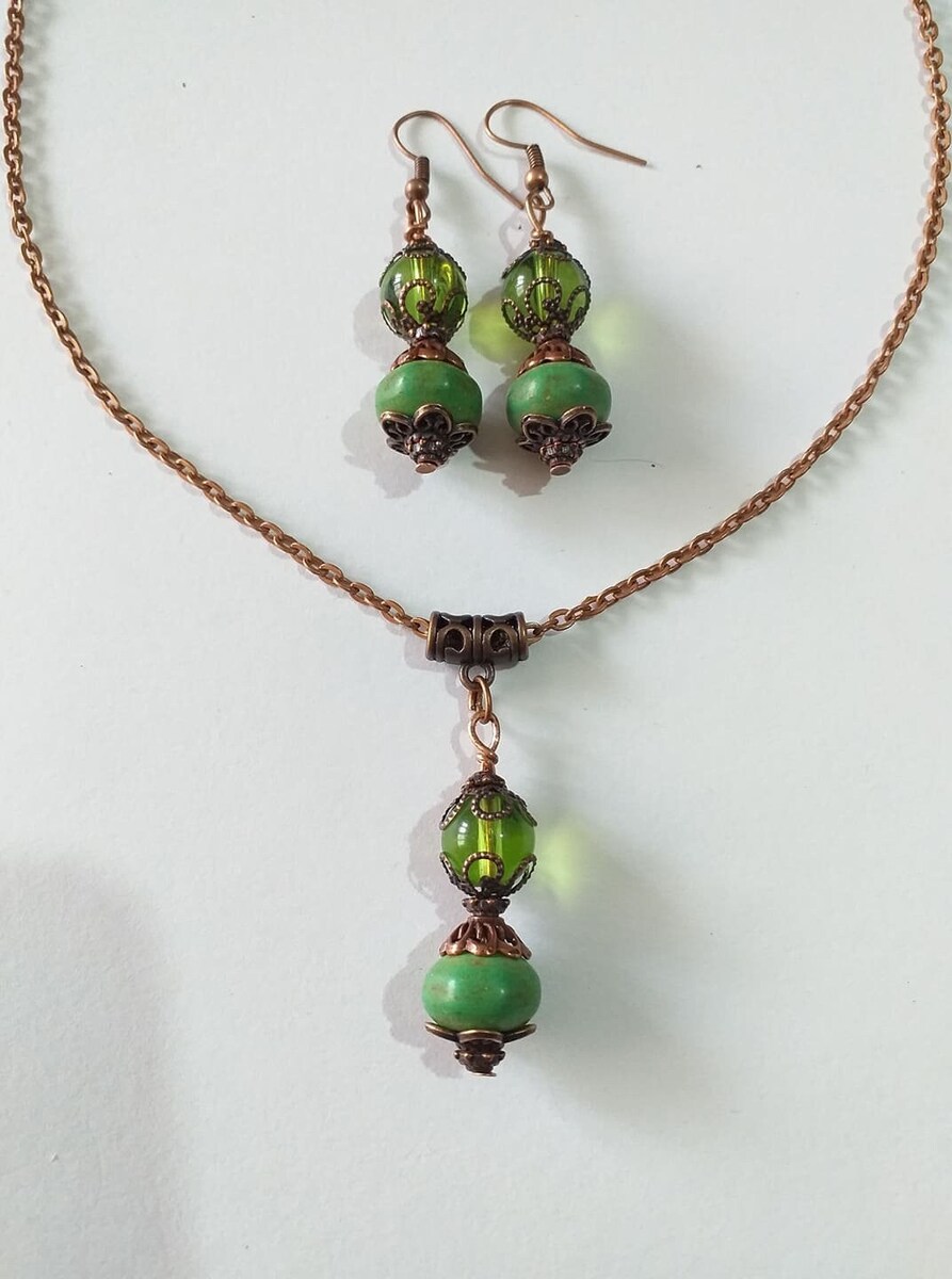 Gorgeous Victorian set ! Copper set green Turquoise and green crackle glass beads earrings and necklace. Bohemian set. Filigree jewelry set Edwardian set . Gypsy jewelry set. Boho jewelry set . Antique style jewelry set.