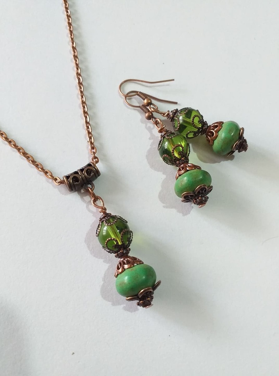Beautiful Set copper Victorian Antique style Turquoise necklace and earrings . Beautiful pendant necklace and earrings with green Turquoise . Boho necklace . Bohemian necklace and earrings . Victorian necklace and earrings .