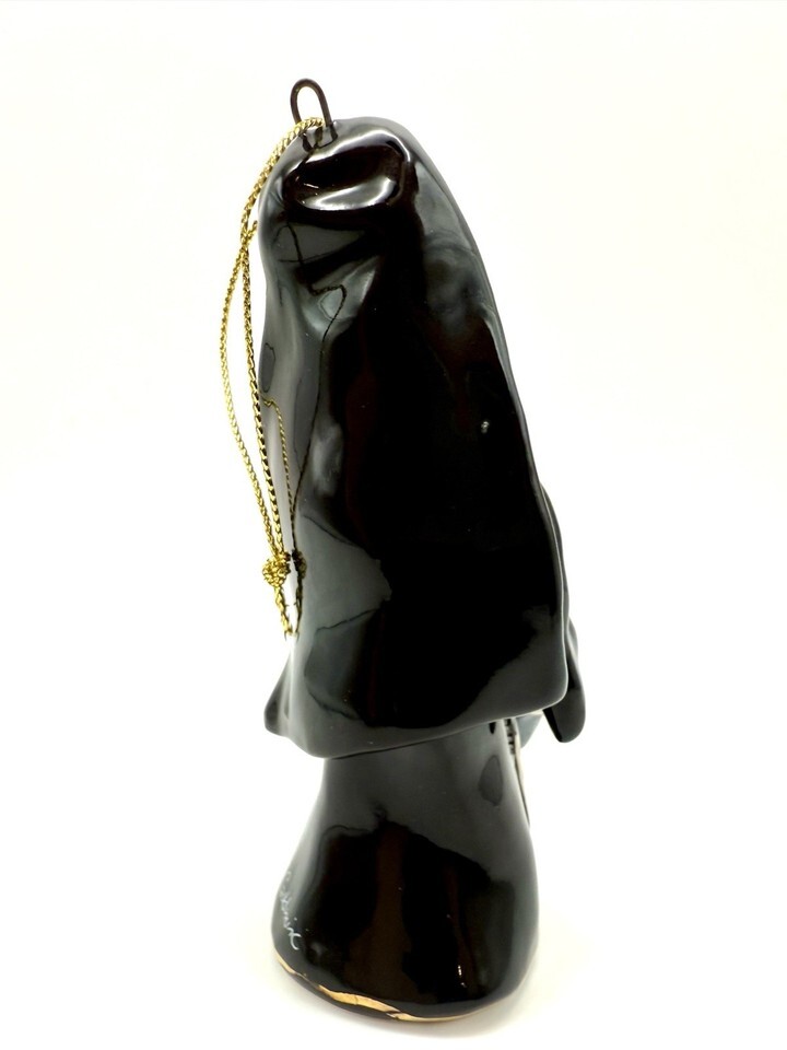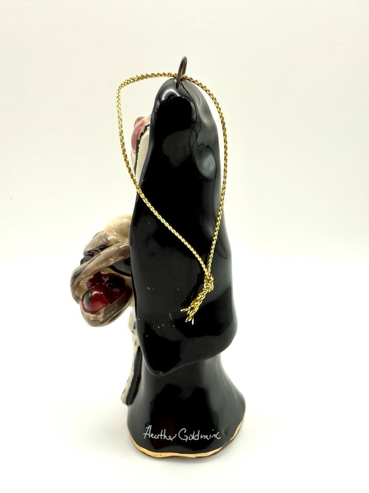 Offered here is an early, hand-signed example of Heather Goldminc?s ?Sister Bountiful?, part of her Sisters of Faith Clayworks series produced before full distribution under Blue Sky Clayworks. This charming ceramic ornament depicts a smiling nun holding a basket of bread and wine, representing abundance and gratitude. The piece is signed in gold by Heather Goldminc herself on the back ? an indicator of her late 1990s studio work. Later production versions carried printed Blue Sky marks and numbered labels, while early hand-signed editions like this are far less common. Heather Goldminc, Blue Sky Clayworks, Sisters of Faith, vintage ceramic nun, collectible ornament, Canadian artist, hand-signed figurine, 1990s pottery, religious gift, whimsical decor Details: ? Artist: Heather Goldminc (signature in gold on back) ? Collection: Sisters of Faith (Clayworks Studio, pre?Blue Sky issue) ? Title: Sister Bountiful ? Approximate date: 1998?2001 ? Material: Hand-painted glazed ceramic ? Height: 5.5? ? Condition: Excellent vintage; no chips, cracks, or repairs ? Notes: Early unnumbered artist-signed edition