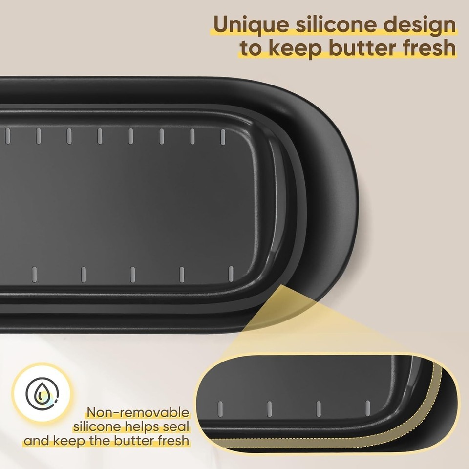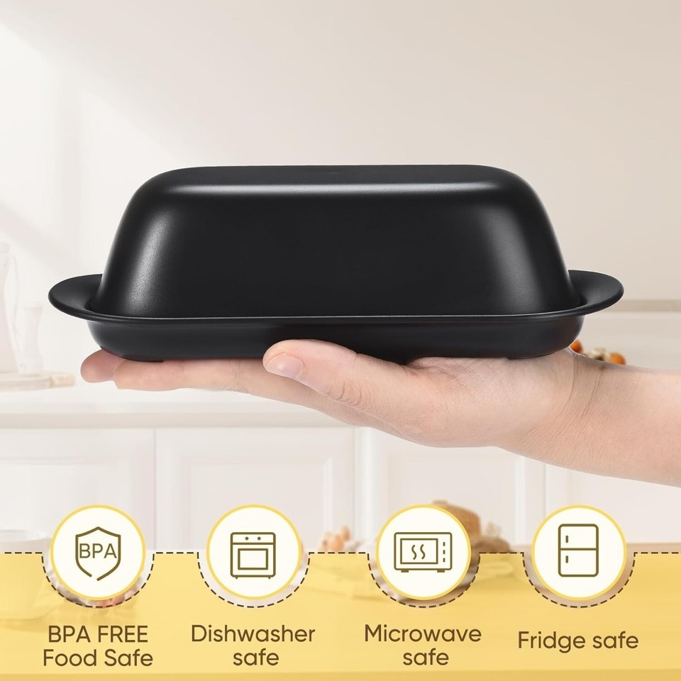 About this item The unique sealing rubber ring design enhances the tightness, so that you can enjoy fresh butter at any time, and the classic design is suitable for many styles of kitchen countertops. Easy scoop design curved ramps on either end of the butter holder, easy to scoop up butter without worrying about the butter slipping away, also scrape off the extra butter at the scraping edges and clean the knife. The butter dish with TBSP markings on both sides provide exact measurements for cooking. Also have soft rubber feet on the bottom, makes it stand in position. And there are also the positions of the butter cutters on both sides, easy to deliver. Made of polypropylene, BPA free and food safe, lightweight and durable, heat resistance -30? to 110?. Can be used for microwave reheating and dishwasher safe, freezer safe. Perfect for east or west coast butter, can't hold the larger blocks of butter. And the butter dish is easy to carry with one hand.