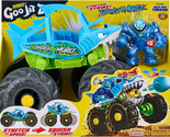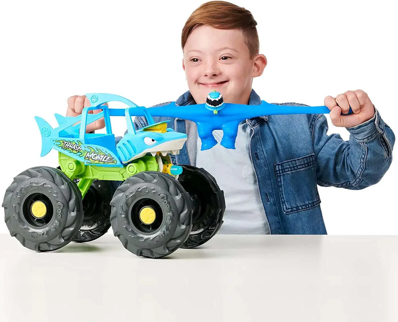 Get ready to roll into the action with Thrash and his awesome "Stretch And Strike" Thrash Mobile! This shark shaped vehicle has two amazing modes! Push down to stretch the wheels out and move along in "Speed Mode" or pull up the chassis and launch an attack in "Strike Mode" and launch missiles from the shark jaws! With "Monster Truck" looks and an attitude to match, this Goo Jit Zu battle machine will have villains shaking in their Gooey boots! Included with the Thrash Mobile is an Exclusive Race Suit Thrash figure! Place him in the Driver's Seat and roll out some squishy damage! Still Super Stretchy as ever, Thrash can stretch up to 3 times his usual size! Then watch as he goes back to his original shape and size. The Goo Jit Zu "Stretch And Strike" Thrash Mobile comes with 3 Missiles that sit in the Doors and the Launcher.
