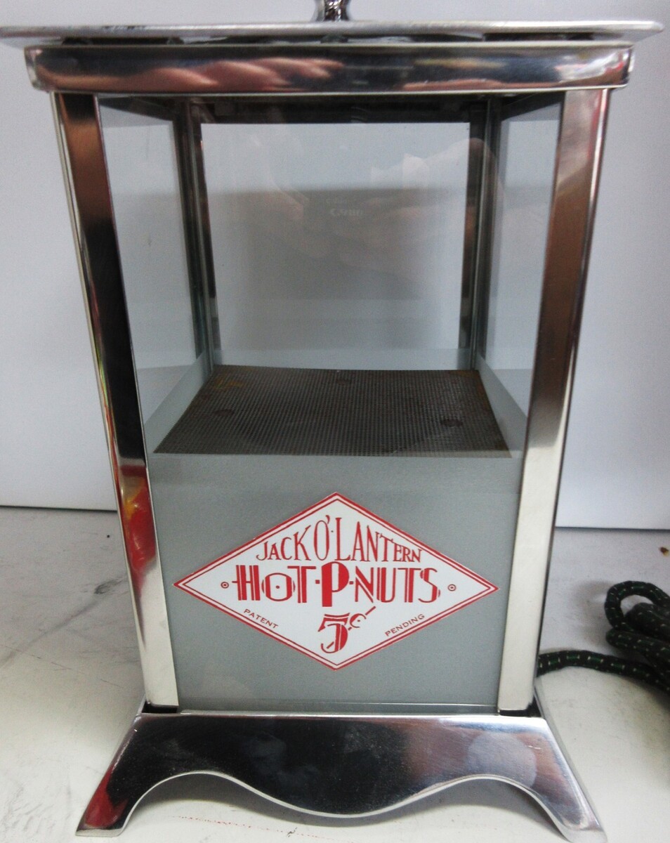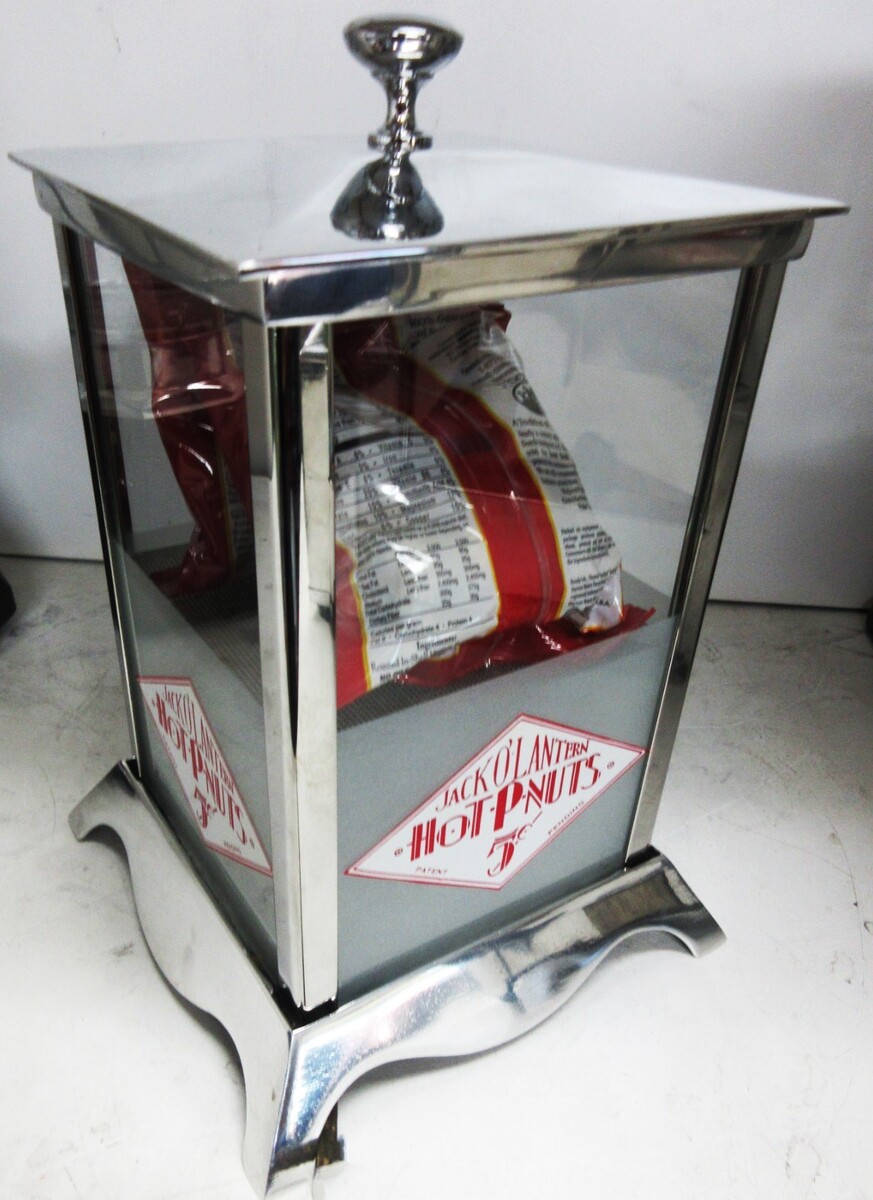 The product is a collectible Jack O'Lantern Hot Peanuts 5c heated vending machine from the 1930s, made in the United States. It is considered new/old stock, meaning it has never been used but is from a bygone era. This unique item is a rare find for collectors interested in vintage vending machines and novelty items. An original Jack O'Lantern 1c hot peanut holder, circa 1930's. The polished aluminum holder has a red heated light bulb on the bottom of the container with a screen mesh on top. The peanuts would fill the container heated by the hot bulb. The container measures 7.5" wide by 7.5" deep by 12" tall. I perfect original condition Only one is available Business since 1979 Thank you for your interest