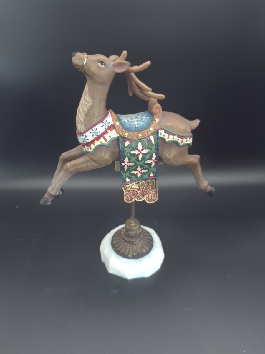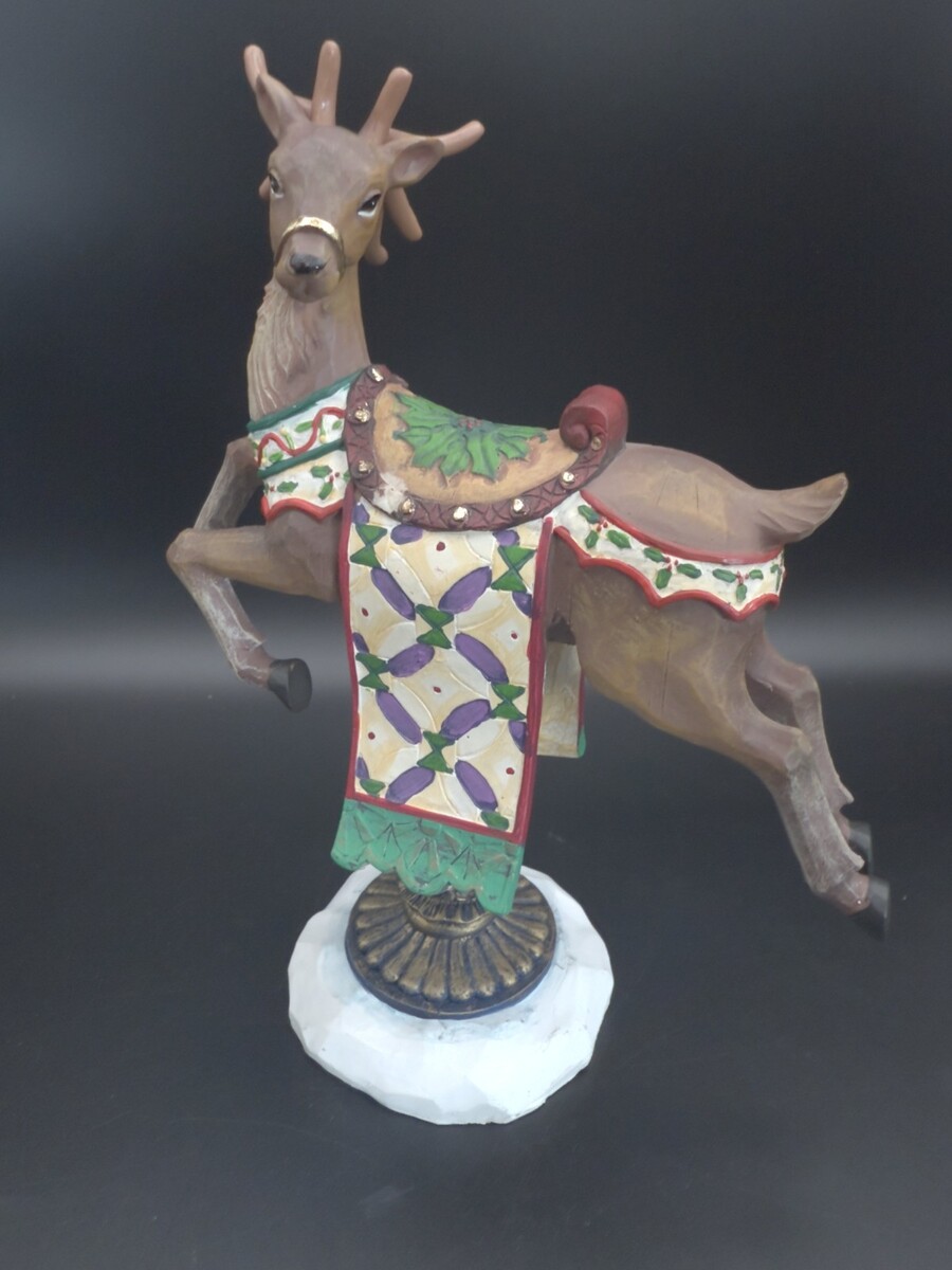 with gifts and three carousel-style reindeer on individual pedestal bases. Each