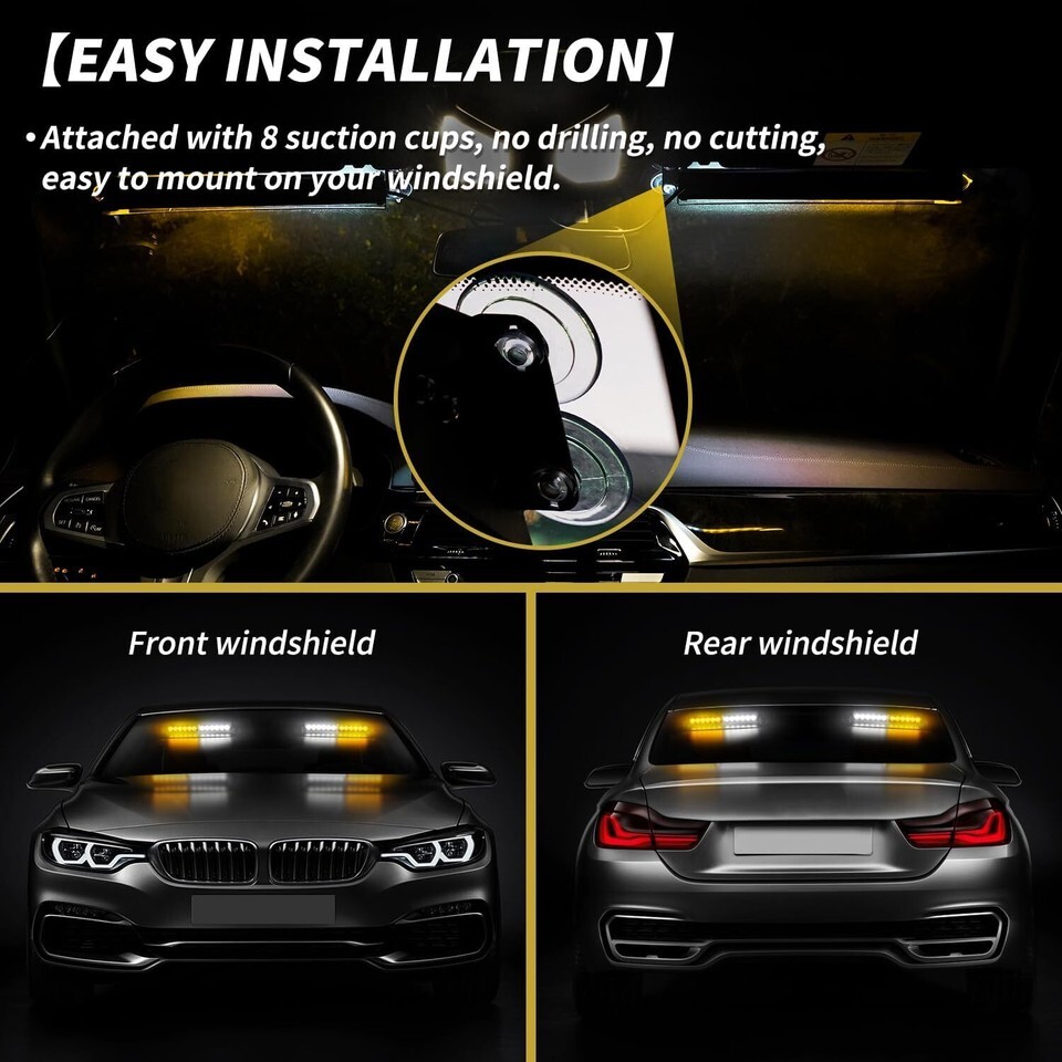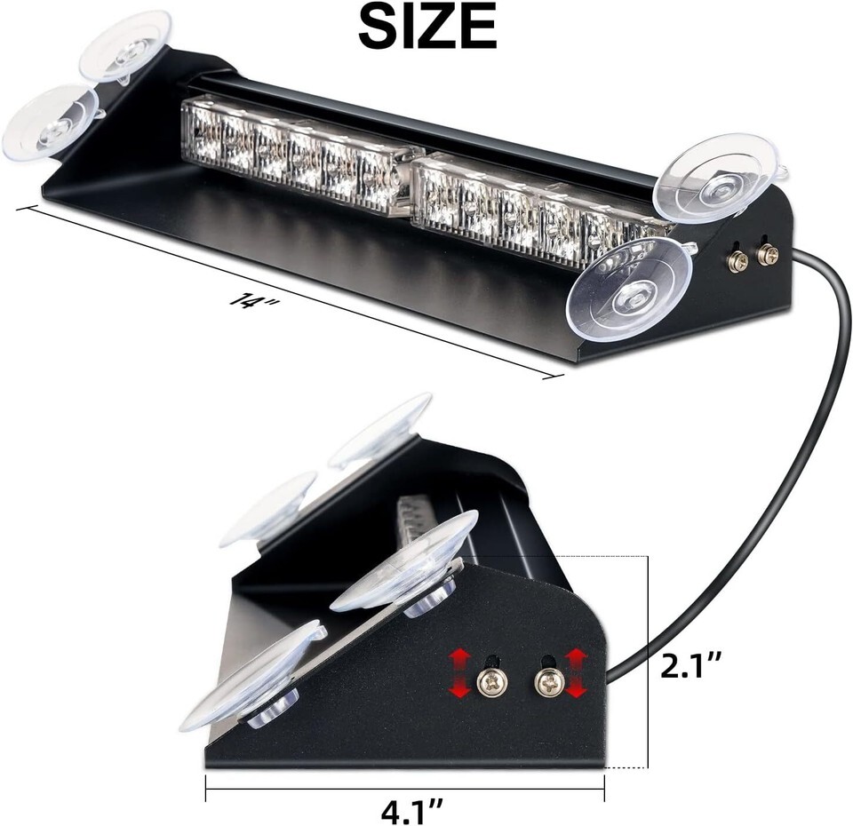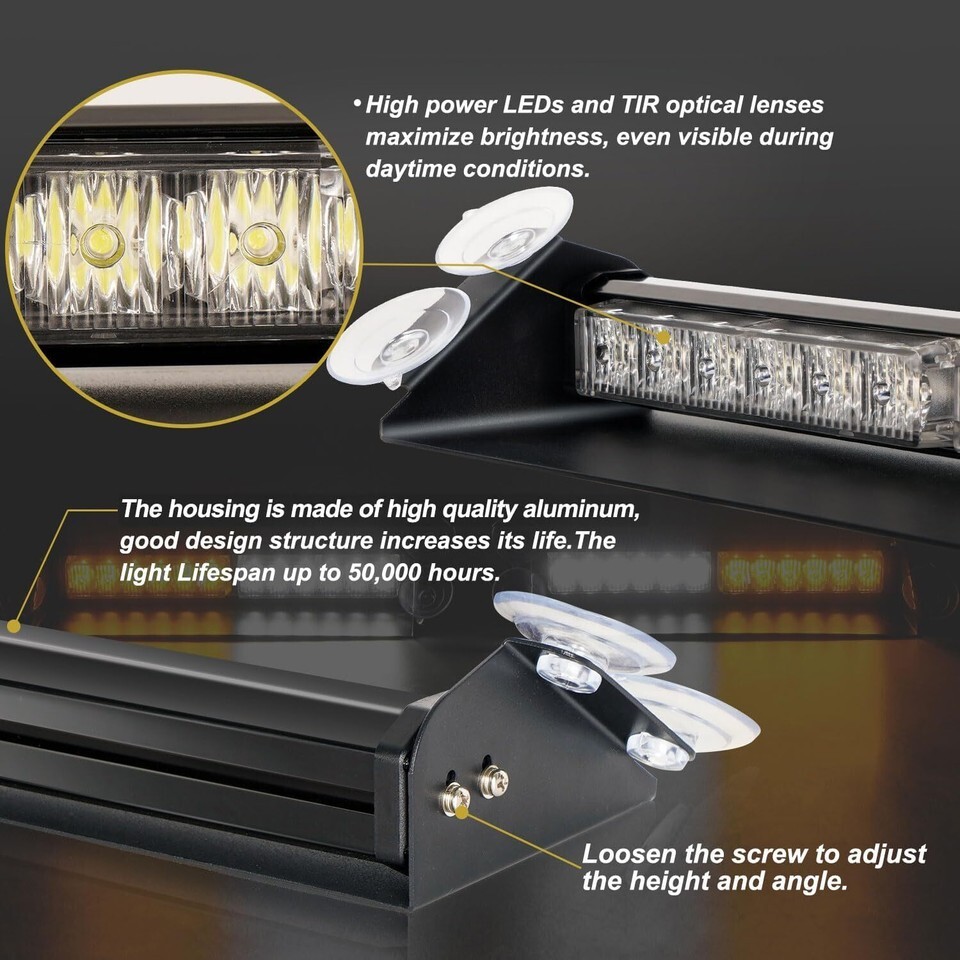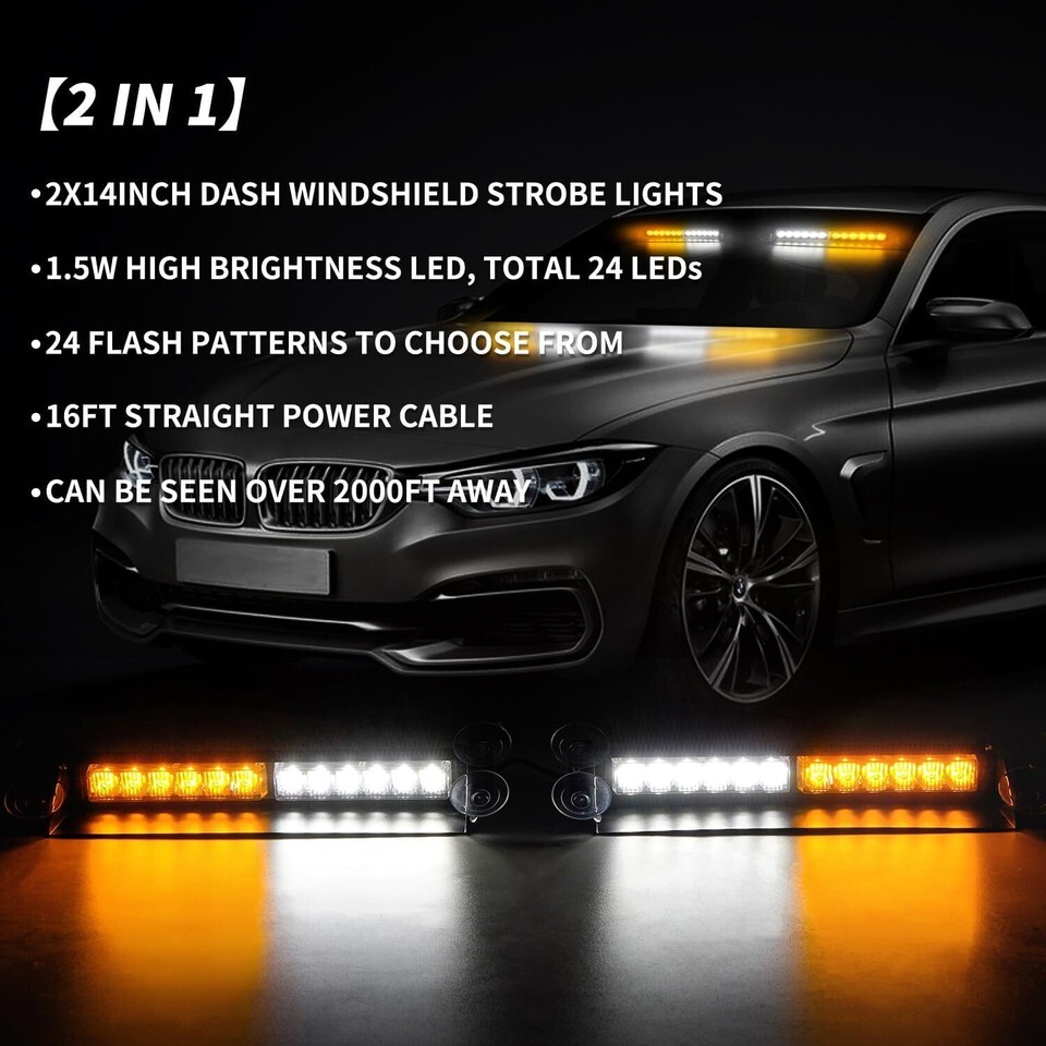 ?SUPER BRIGHT?2 in 1 windshield dash strobe light bar is designed with 24 high intensity LEDS, 1.5W High power LED and TIR optical lenses maximize brightness, even visible during daytime conditions. Bright enough to be seen more than 2000ft in distance.