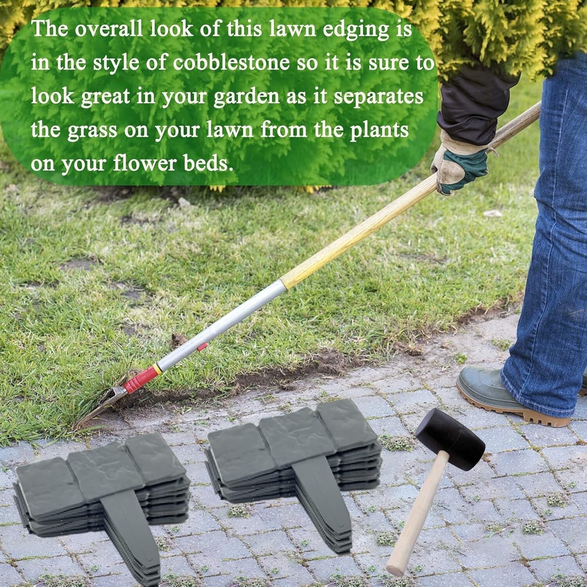 Trim a sidewalk, flower bed or ring a tree trunk with a border that looks just like real cobblestones?in just minutes and at a fraction of the cost. Interlocking pieces snap together and stake into the ground to give your landscaping a manicured look. You can create any shape that you want as these are bendable! Purchase multiple sets to achieve the length that you want! Use the 'add to cart' and see all of our discounts that we have to make it even more affordable for you!