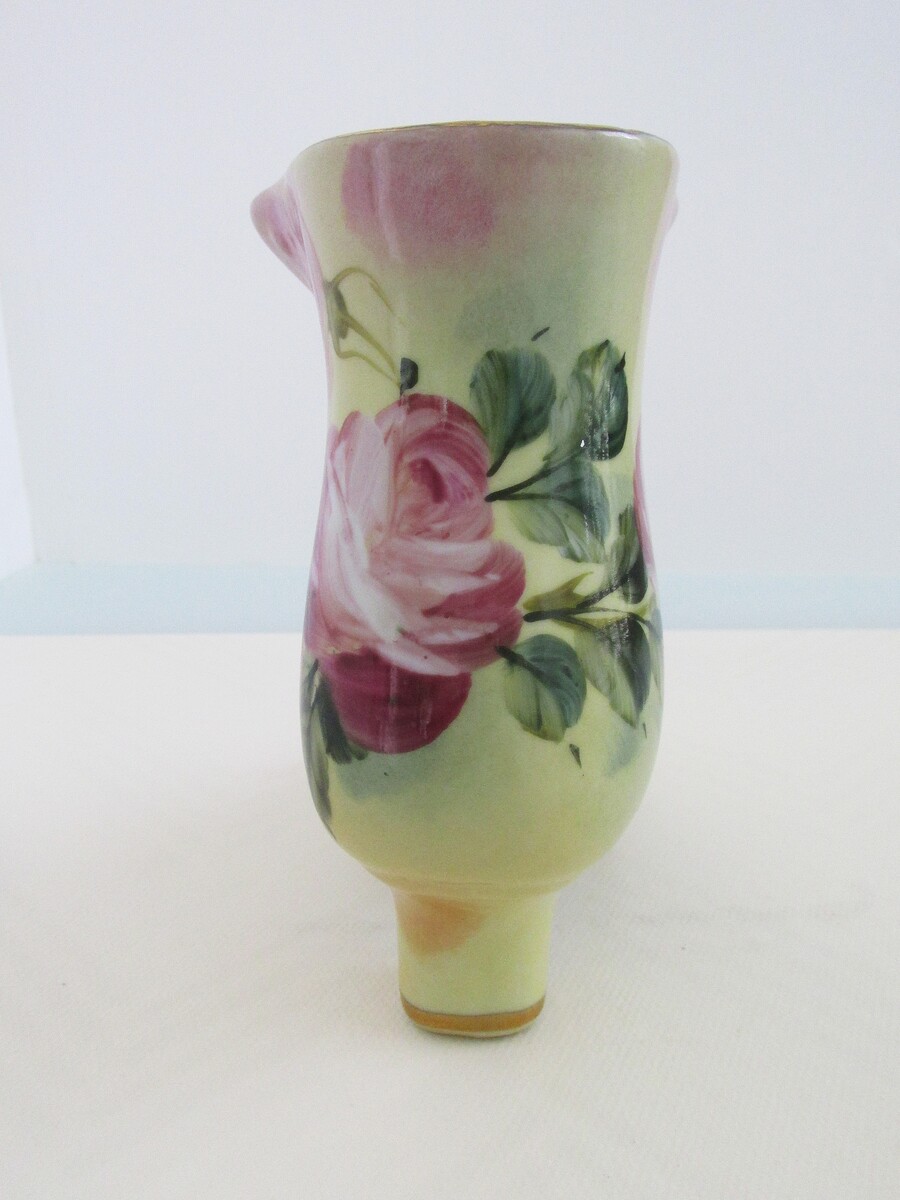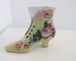 Description: Up for sale is a vintage Limoges (with mark) hand painted porcelain ceramic Victorian boot. This figurine is hand painted with pink white roses and green leaves. It has a yellow green base color with gold accent gilding. The overall height is 5.75", the width (at the widest point) 2.75", and the length (at the longest point) 7.25". This figurine is in perfect condition. It has no cracks, or chips and never has needed repair.