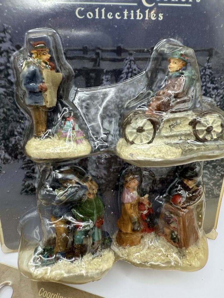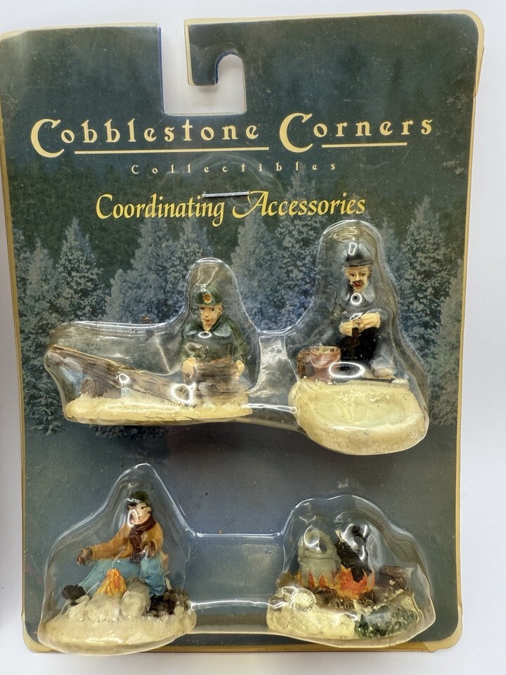 Create a cozy holiday village scene with this bundle of four vintage Cobblestone Corners Collectibles / Windham Heights Coordinating Accessories sets ? all new in original packaging (NIP). Each set includes finely detailed miniature resin figures and accessories designed to complement Cobblestone Corners Christmas village displays (compatible with Lemax and Department 56 scales). These charming pieces capture nostalgic winter scenes like families gathered, villagers around campfires, and sledding fun ? perfect for building out your village or gifting to a collector. Included Sets: 1. Cobblestone Corners ?Coordinating Accessories? set ? villagers at campfire bench scene 2. Windham Heights by Cobblestone Corners ? 3 assorted figure packs (villagers, sled scene, family groups) 3. Total of 4 unopened packs / approx. 12 miniature figures and accessories Details: ? Brand: Cobblestone Corners / Windham Heights ? Material: Hand-painted resin ? Scale: Approx. HO (1:64) ? fits standard Christmas village displays ? Condition: New Old Stock ? new in original packaging; packaging may show some age related yellowing and light shelf wear from storage ? Era: Late 1990s?early 2000s ? Great for collectors or nostalgic village displays ? Perfect for: vintage Christmas collectors, holiday village decorators, or anyone restoring a classic Cobblestone Corners display.