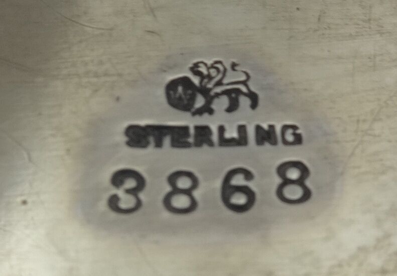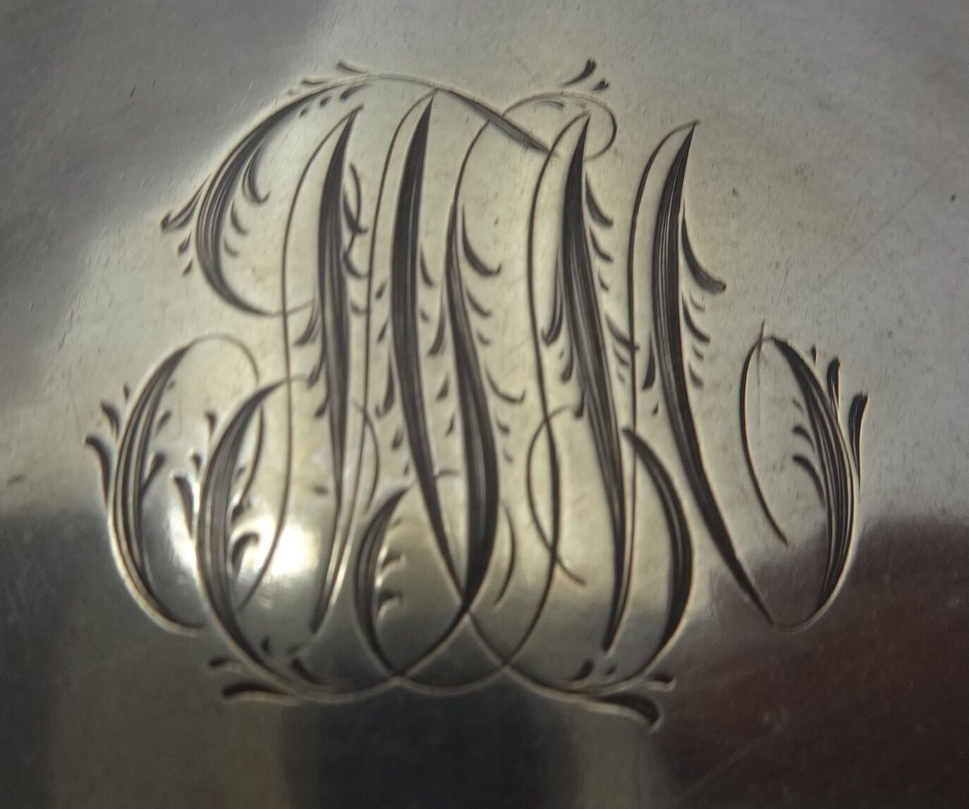 Exquisite Louis XV by Whiting sterling silver candy dish. It has a fancy pierced interior, has a scrolly monogram (see photo), is marked with #3868, and it dates from the 1890's. The measurements for the candy dish are 1" x 6 3/4" x 5", and it weighs 2.5 ozt. It is in excellent condition. Wonderful! SKU#0449.