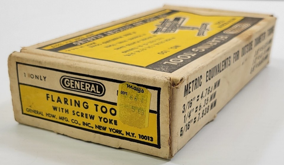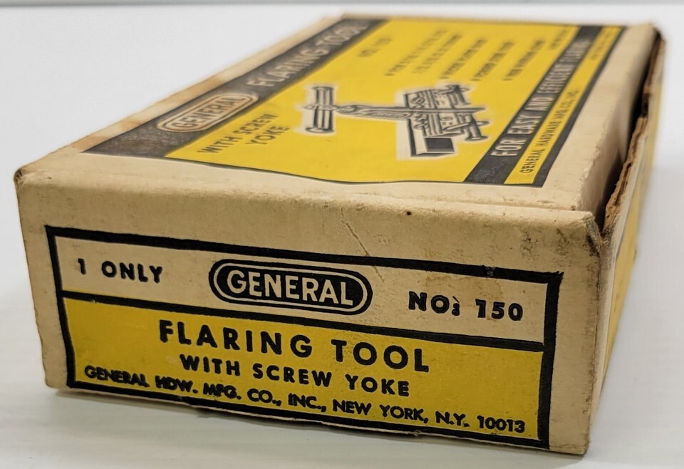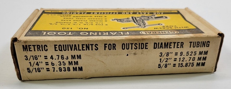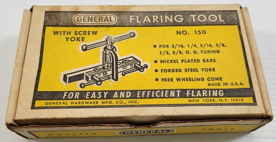Vintage General Tube Flaring Tool with Screw Yoke No 150 For 3/16, 1/4, 5/16, 3/8, 1/2, 5/8 tubing Tool is in good, possibly un-used vintage condition.