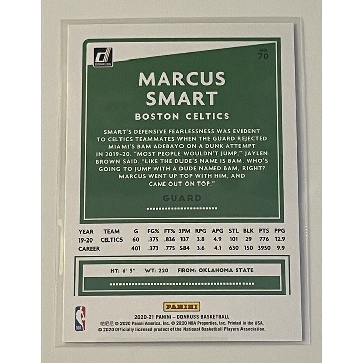 Showcase your love for the Boston Celtics and Marcus Smart with this 2020-21 Panini Donruss Basketball Base NBA Card #70. This single card is perfect for basketball enthusiasts and collectors alike. It features an ungraded card stock with a 20 Pt. thickness, making it a durable item for display.