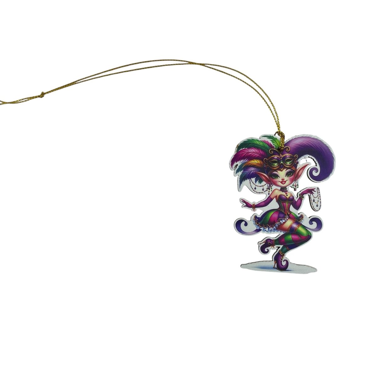 Celebrate the festive spirit of Mardi Gras with this charming elf ornament crafted from lightweight wood. Featuring a vibrant design with rich purples, greens, and golds, this ornament showcases a whimsical elf dressed in a colorful jester-style outfit complete with a feathered mask, jewelry, and striped stockings. The intricate detailing and playful pose capture the lively essence of Mardi Gras celebrations. This holiday ornament hangs from a gold cord, making it easy to display on your Christmas tree or as part of seasonal decor. The smooth wood material allows for a sturdy yet delicate feel, perfect for collectors and fans of unique holiday decorations. Its vivid colors and artistic style make it an eye-catching addition to any festive setting, embodying the joyful Mardi Gras theme with a touch of fantasy.