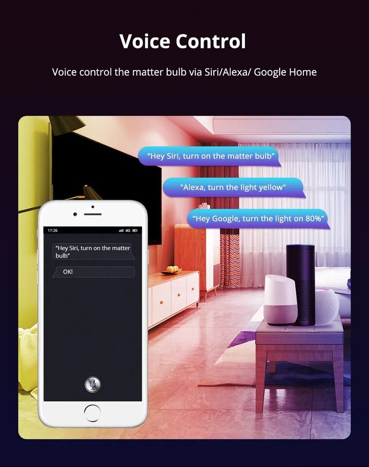 [ Matter Smart Home ] You can enjoy a unified smart home experience. Whether you have a smart hub from Amazon, Google, or Apple, or rely on apps like Alexa, Google Home, or Apple Home, you can control Matter bulbs with voice commands and the same mobile app.