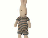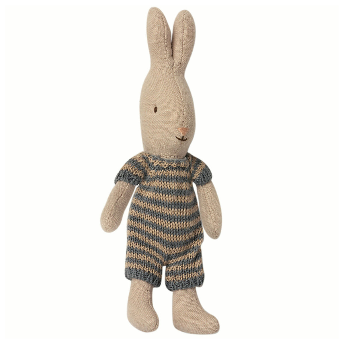 This soft miniature rabbit comes dressed in a beautifully knitted striped romper made from a gentle linen/cotton blend. Its compact 6-inch size makes it perfect for dollhouses, miniature furniture, or small imaginative play setups.