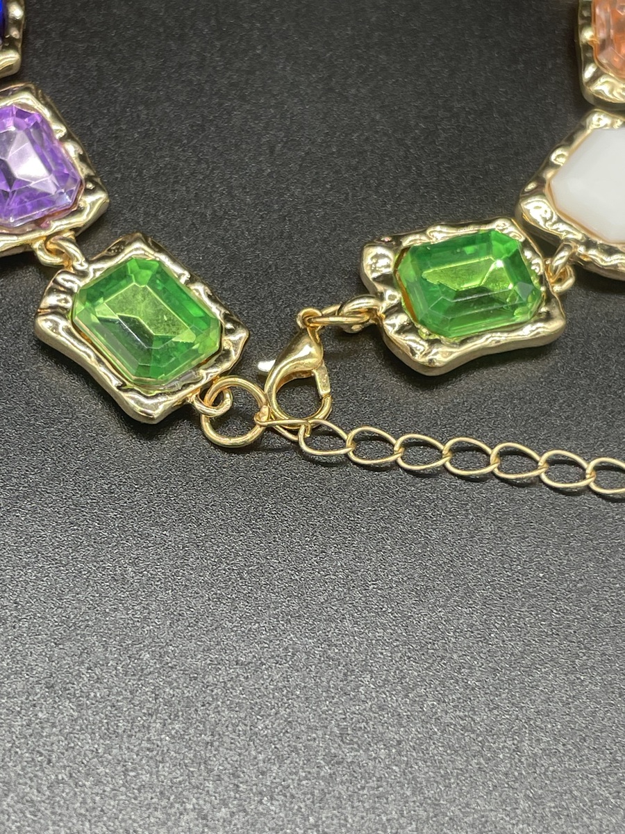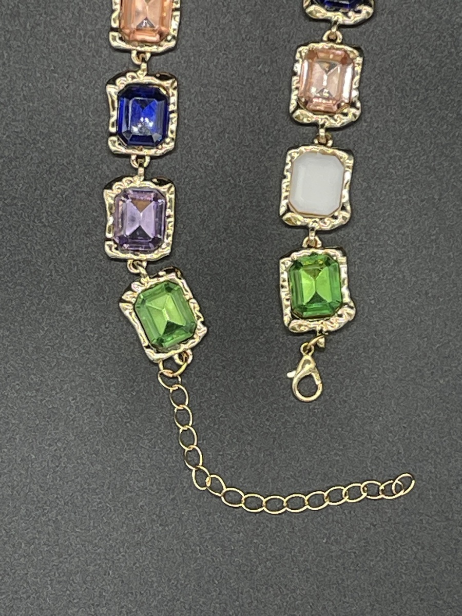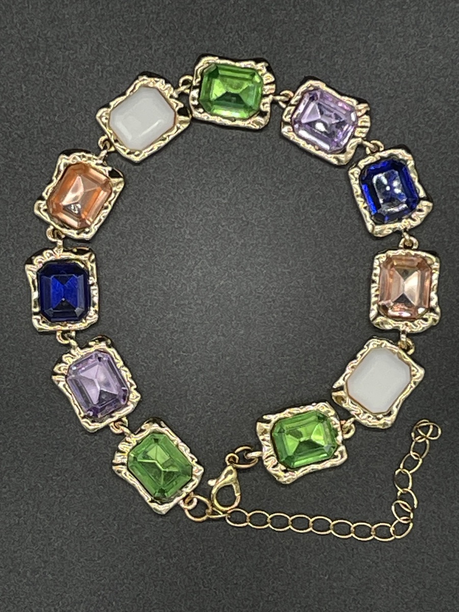 Elevate your accessory collection with this vibrant Multi Color Amethyst Crystals PLUS SIZE 9 INCH braclet that's fully adjustable. The braclet boast a stunning array of emulated stones from around the world by rich colors that are cut in a way to sparkle when ever worn. Each of the 11 gemstones are carefully set in a rectangular shape, adding a touch of sophistication to this charm-style piece. The braclet's adjustable design ensures a comfortable fit for any plus size wrist, making it a versatile addition to your jewelry repertoire. Crafted with multi color crystal materials, this braclet exudes beauty and elegance, making it perfect for any occasion. Whether you're dressing up for a night out or adding a splash of color to your casual wear, this charm bracelet is sure to impress. All bracelets sent in a blue gift bag.