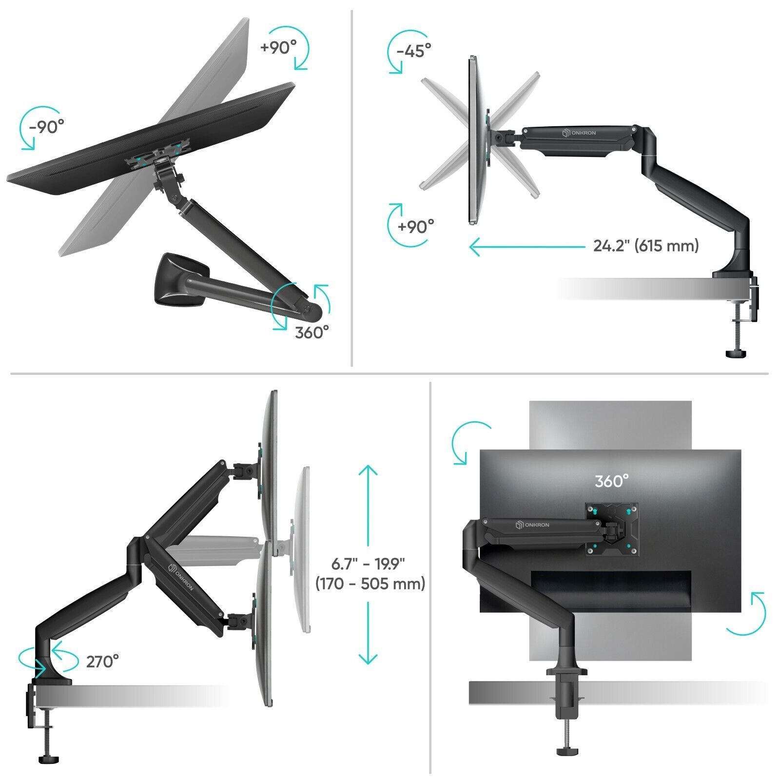??FULL MOTION ARM: tall computer monitor mount supports an up-down tilt from +90 to -45, left-right swivel 180 and 360 rotation. Rotate it into landscape or portrait view, and fix it in any position on your eye level. The flexible monitor mount arm can extend up to 24.2" in length and rise to 19.8" in height.