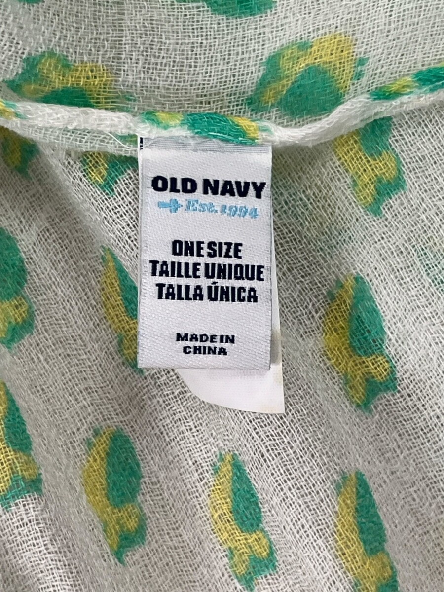 Charming Old Navy scarf featuring a whimsical owl print in green and yellow on a soft white background. Lightweight and semi-sheer, it?s perfect for layering in any season. Finished with delicate fringe at both ends for added texture and style.
