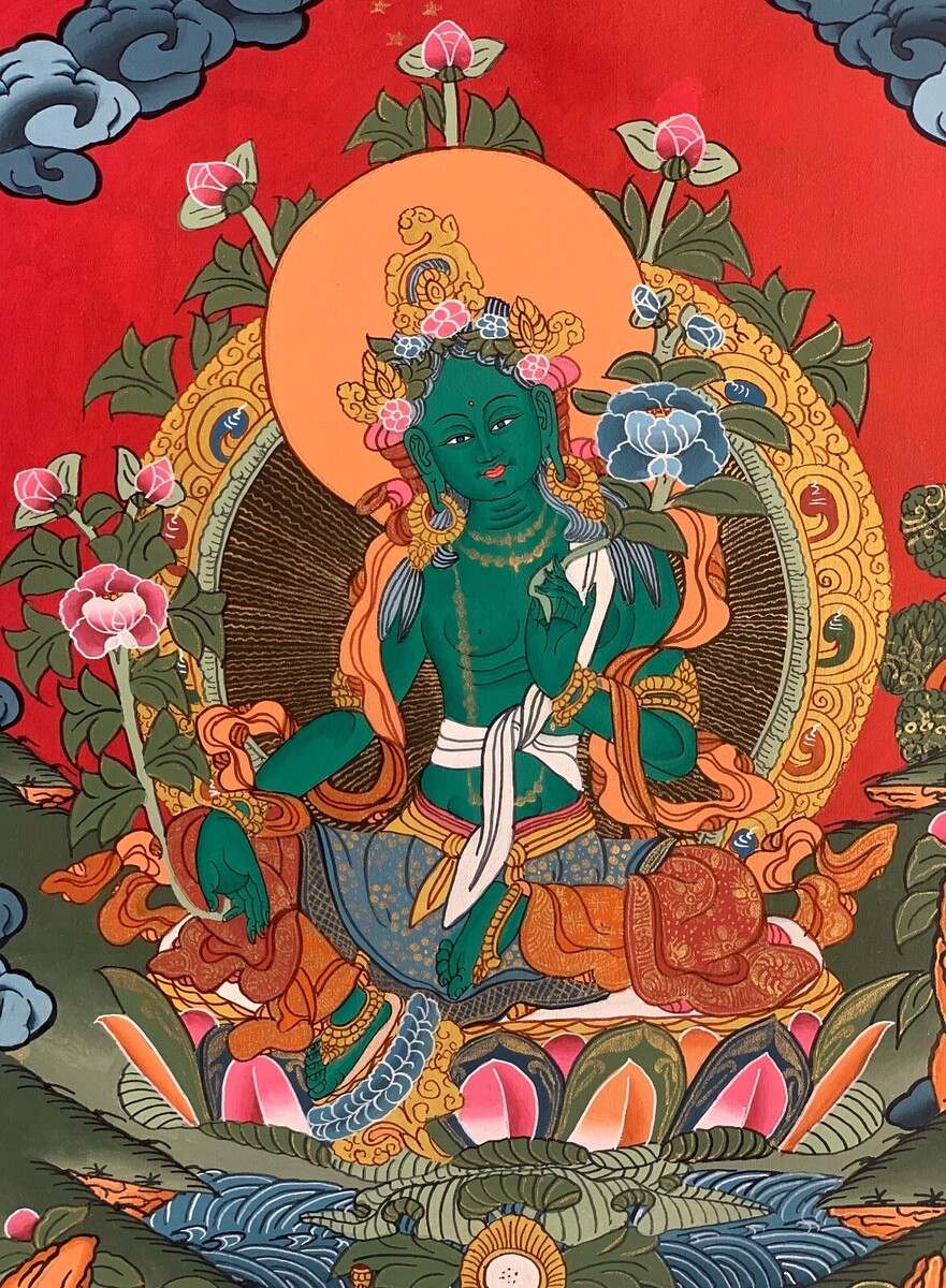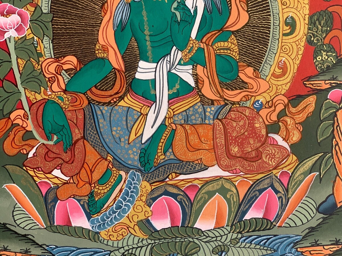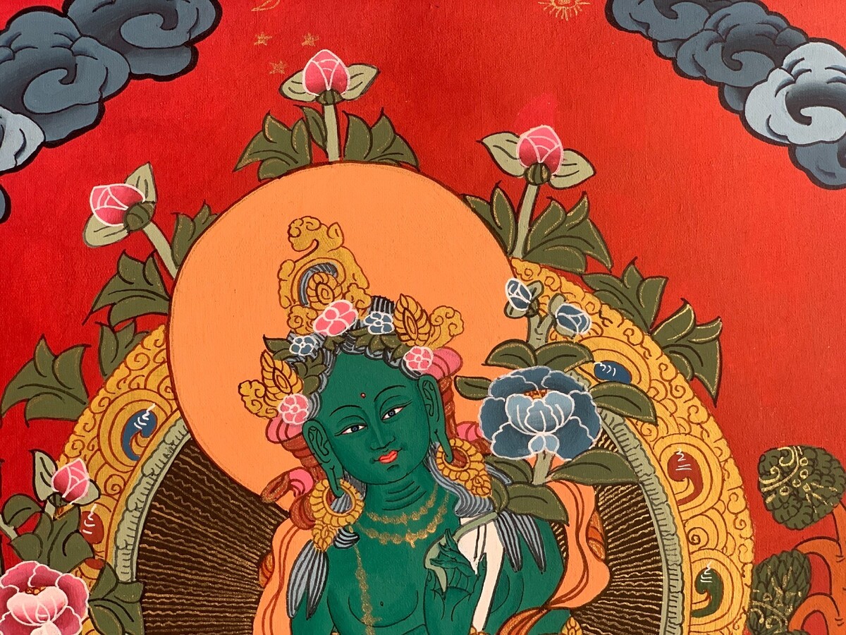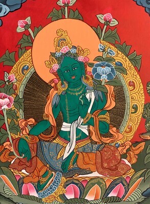 - ORIGINAL HAND PAINTED GREEN TARA MOTHER TIBETAN THANGKA PAINTING WITH SILK FRAME
