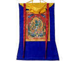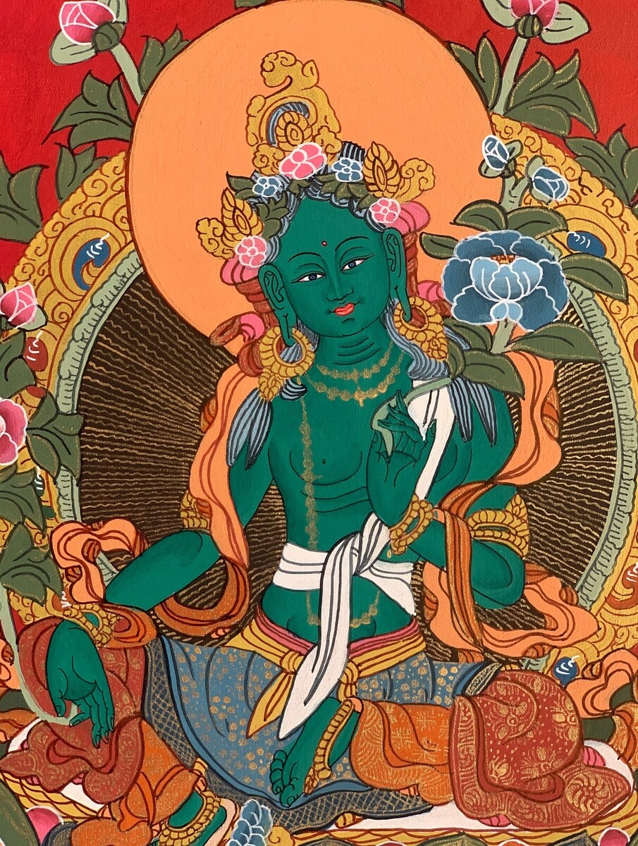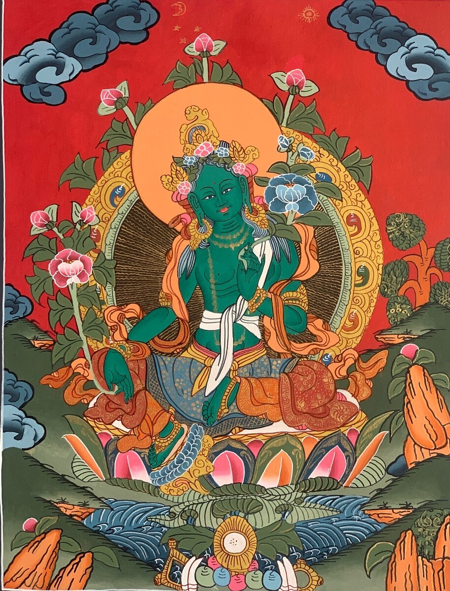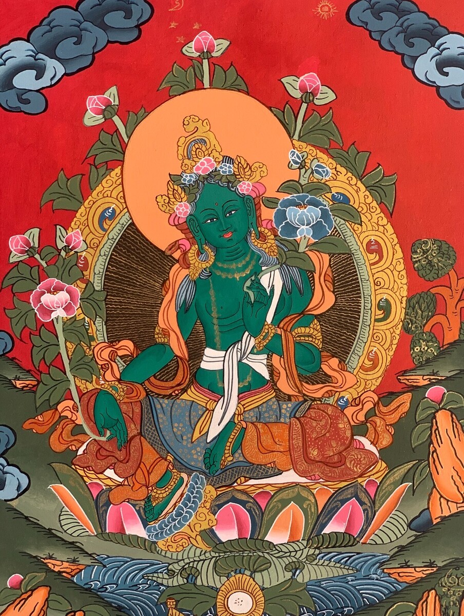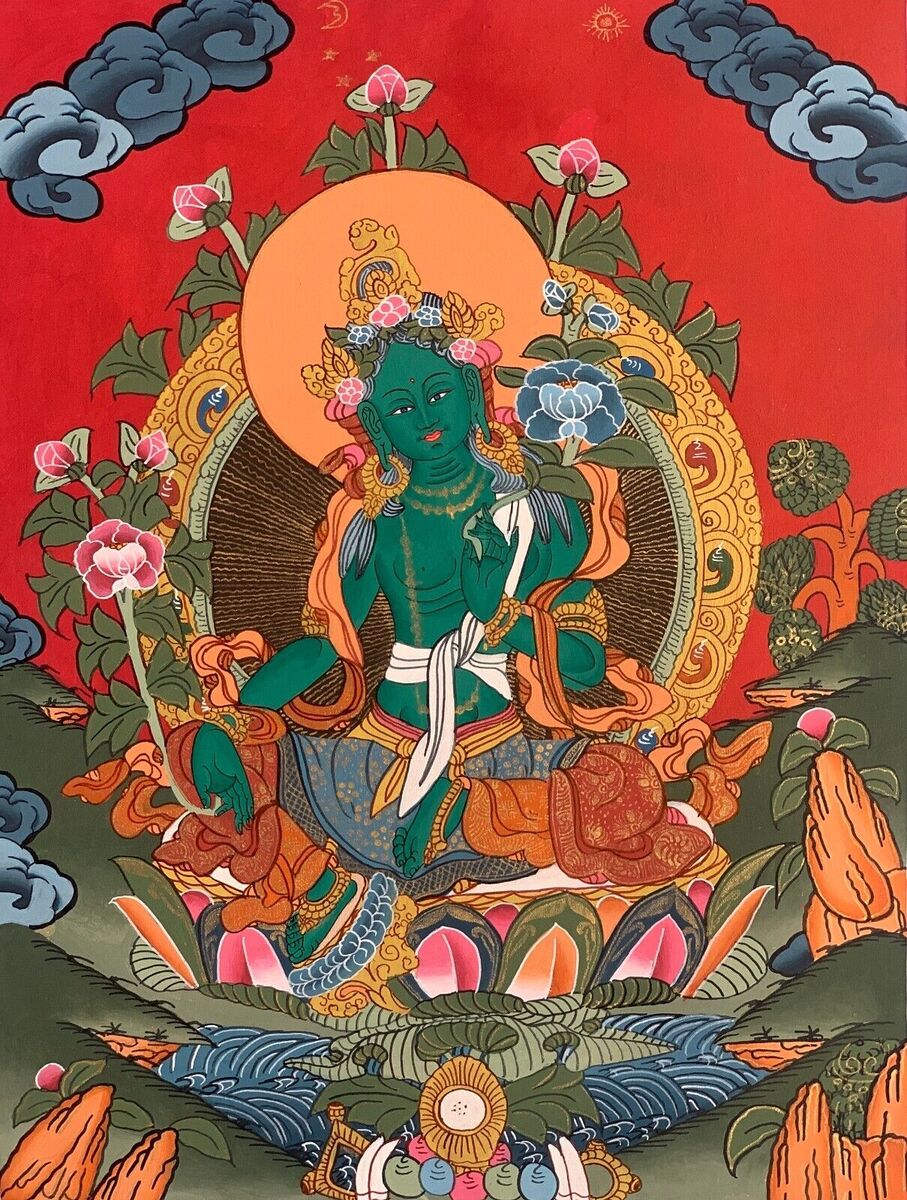 - ORIGINAL HAND PAINTED GREEN TARA MOTHER TIBETAN THANGKA PAINTING WITH SILK FRAME