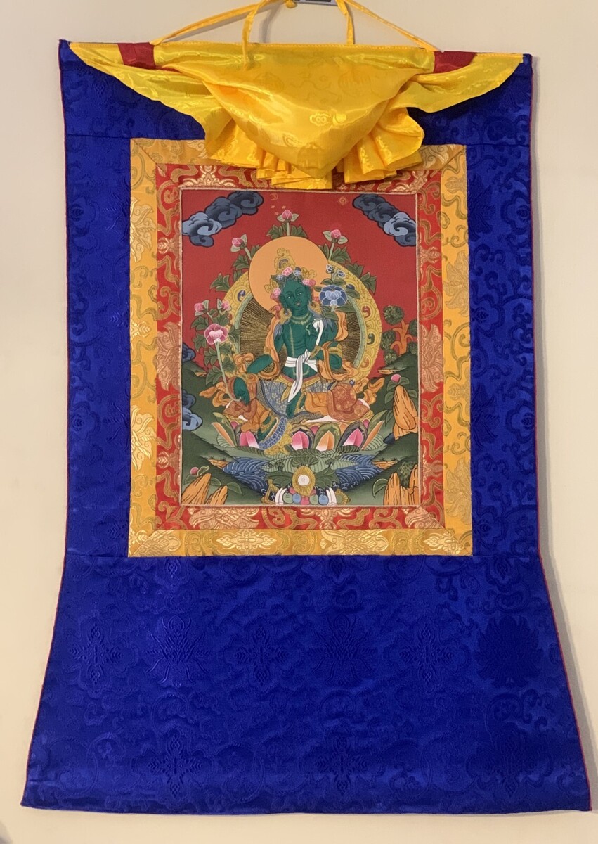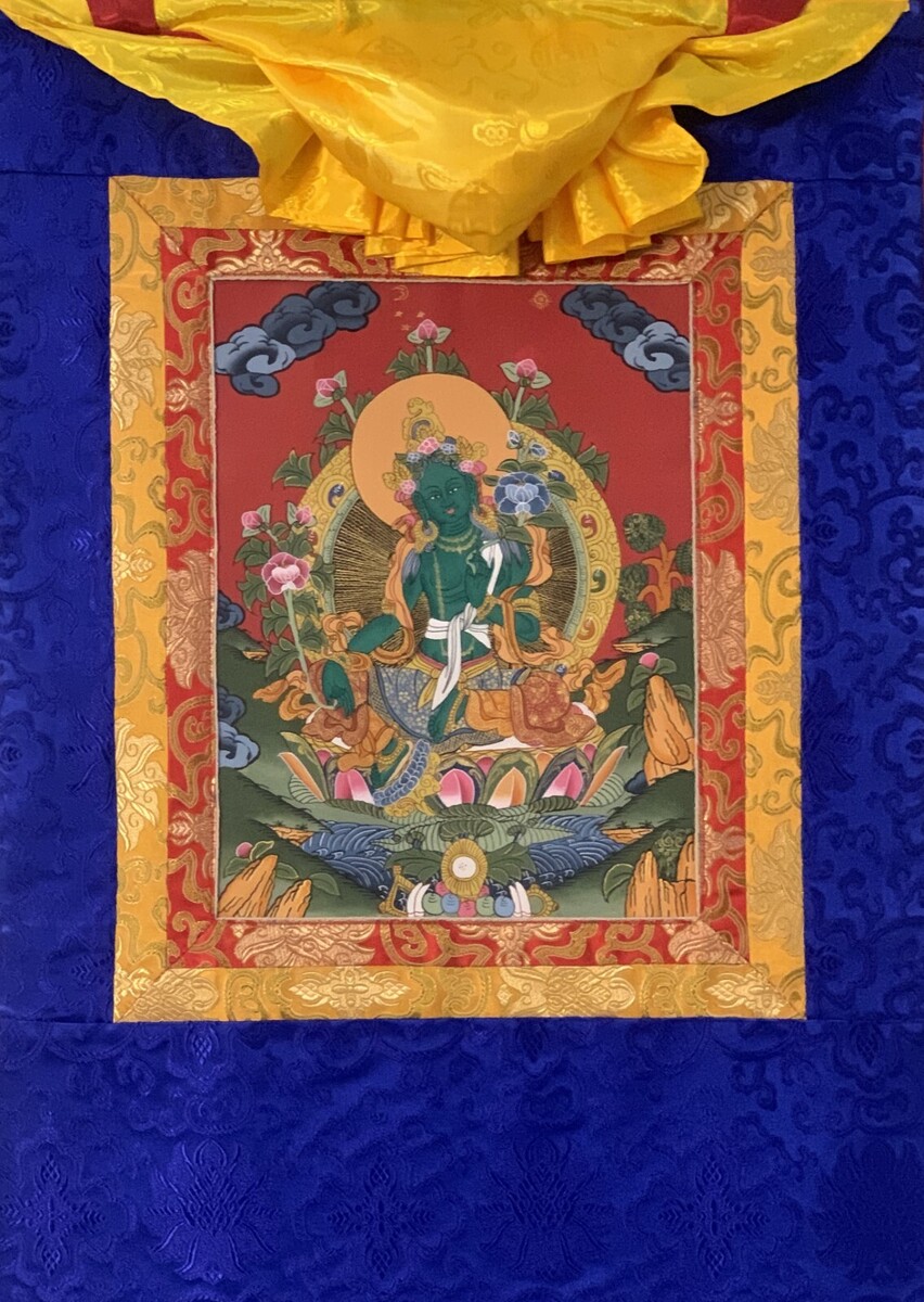 ORIGINAL HAND PAINTED GREEN TARA MOTHER TIBETAN THANGKA PAINTING WITH SILK FRAME