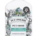 Pet-Pourri Pawsitively Fresh Pet Odor Deodorizer Spray Love your pets, but not their smells? Pet~Pourri Pawsitively Fresh Pet Odor Deodorizer Spray is your go-to pet and home deodorizer, powered by our Proprietary Funk Lock Technology. This multi-surface odor remover doesn?t just mask smells, it removes funky odors at the source. Infused with a light, uplifting blend of Pineapple, Jasmine, and Pear, this Air + Fabric freshener spray keeps your home and pets smelling amazing between cleanings. Suitable for use in the air and on fabrics, it refreshes pet bedding, furniture, carpets, couches, rugs, and even car seats, making it a must-have for pet owners. Made with natural, plant-based ingredients and pet-friendly essential oils, so you can freshen your space without worry. Whether it?s your furry friend?s favorite corner or a surprise mess, a quick spritz helps freshen the space with a naturally clean scent?up to 800 uses per bottle. From the makers of Poo~Pourri, Pet-Pourri lives up to the Pourri Promise?plant-based, stink-stopping solutions that work anywhere odors lurk. Whether it?s shoes, trash cans, diaper pails, fabrics, or your furry friend?s favorite spot, there?s a Pourri for that.