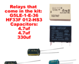 Relays that come in the kit: G5LE-1-E-36, HF33F 012-HS3, and Capacitors: 4.7uf, 4.7uf, 330uf