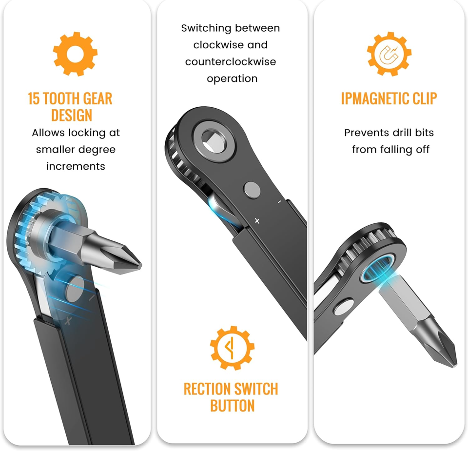 This tool features an efficient ratchet system that allows for fast work. Simply insert the drill bit into the square opening and flip the button to change the direction for tightening or loosening screws. Whether for home maintenance, auto repair, or appliance fixes, this reversible ratchet screwdriver is ideal for getting the job done quickly and effortlessly.