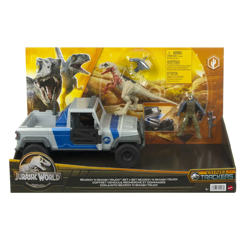 This Jurassic World Search 'N Smash Truck toy set consists of a push-along vehicle with destruct feature, a mercenary figure with accessory and an Atrociraptor dinosaur, all built at 3.75-inch scale. The destruction feature of the 9.9-inch long off-road vehicle is a dramatic smashable front hood! It also includes working wheels and doors and a cargo area for storing the captured Atrociraptor. The Atrociraptor figure comes with cool tracker gear like the dinosaurs in the Jurassic World Dominion tracking teams and features posable limbs and scannable DNA code. Makes a great gift for any dinosaur enthusiast aged 4 years or older especially Jurassic World fans. Connected play! Scan the dinosaur's hidden Tracking Code in the free Jurassic World Facts App with a compatible smart device (not included) to initiate AUGMENTED REALITY activities and games. Augmented fun! Kids can explore thermal and X-ray modes, chase and capture dinosaurs in different habitats, as well as rescue and release dinosaurs in their correct habitats in exciting adventure games.