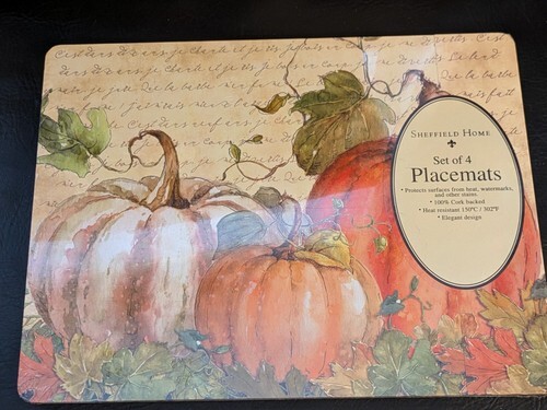 Add a touch of autumnal charm to your dining table with this set of 4 Sheffield Home placemats. The pumpkin pattern, featuring a wild apple design, is perfect for the fall season and will add a pop of color to any table setting. Made of durable cork material, these placemats are built to last and can be easily cleaned. Ideal for both summer and fall occasions, this placemat set is a must-have for any collector of Sheffield Home products. The multicolor design and high-quality construction make these placemats a great addition to any kitchen or dining room. Don't miss out on the chance to add this fantastic set of placemats to your collection.
