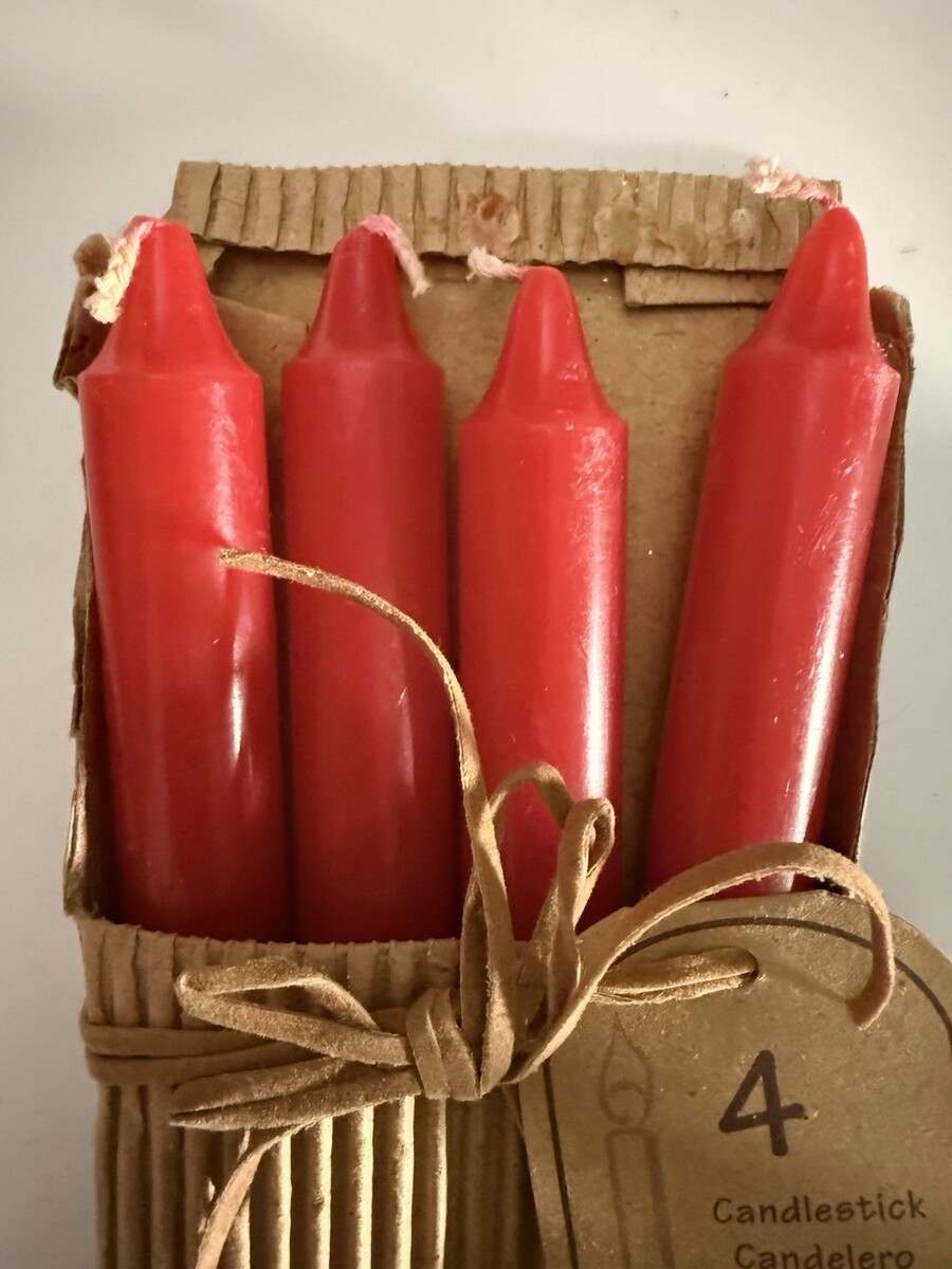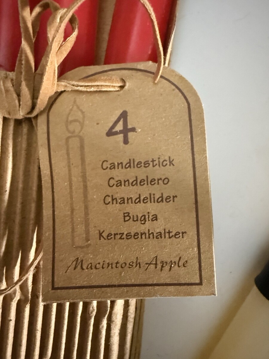 Cozy table-top vibes in one bundle: set of 8 taper candles including a boxed 4-pack of red Macintosh Apple scented candlesticks (item TG095-R, burn time 6?8 hours each) plus 4 unscented ivory tapers tied with a brown ribbon. Classic 10" slender shape fits most standard candlestick holders for dining tables, mantels, centerpieces and holiday decor. Perfect for everyday ambiance, Thanksgiving tablescapes, Christmas decor or stocking-stuffer gifts for candle lovers.